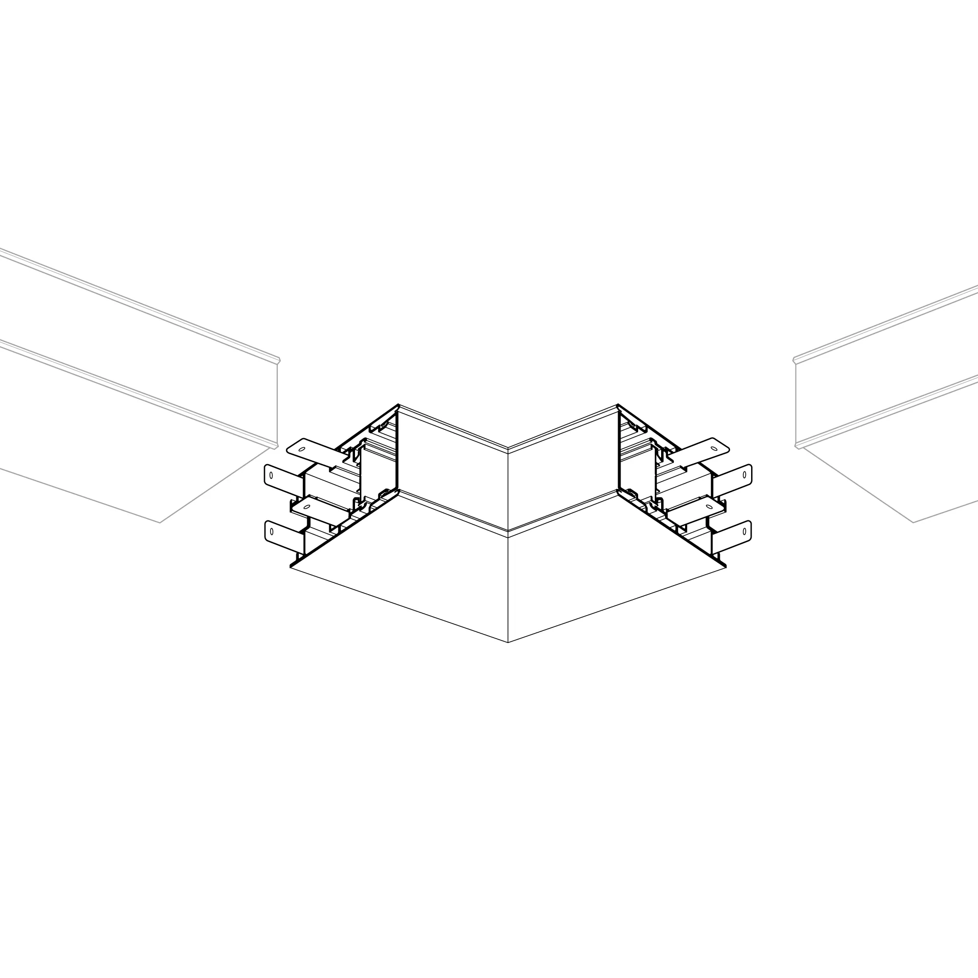 Внутренний прямой угол в сборе для соединения 2-х профилей S2-LINE-4067 под прямым углом 90°. Экран образует линию внутри угла. В комплекте матовый экран, площадка для ленты, соединители. Длина внешней стороны угла 100мм.