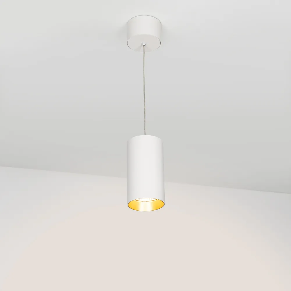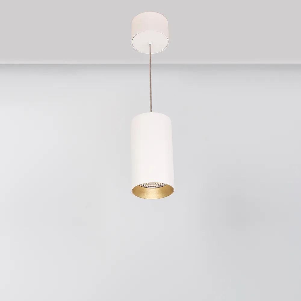 Подвесной светильник 15Вт, белый круглый корпус, золотистая вставка, металл. Цвет ТЕПЛЫЙ БЕЛЫЙ 3000K, св.поток 1100лм, CRI(Ra)>80, угол 40°. Размер Ø85x155мм. Встроенный драйвер PRI:220-240VAC, SEC:DC 350mA 30-43V 15Вт.