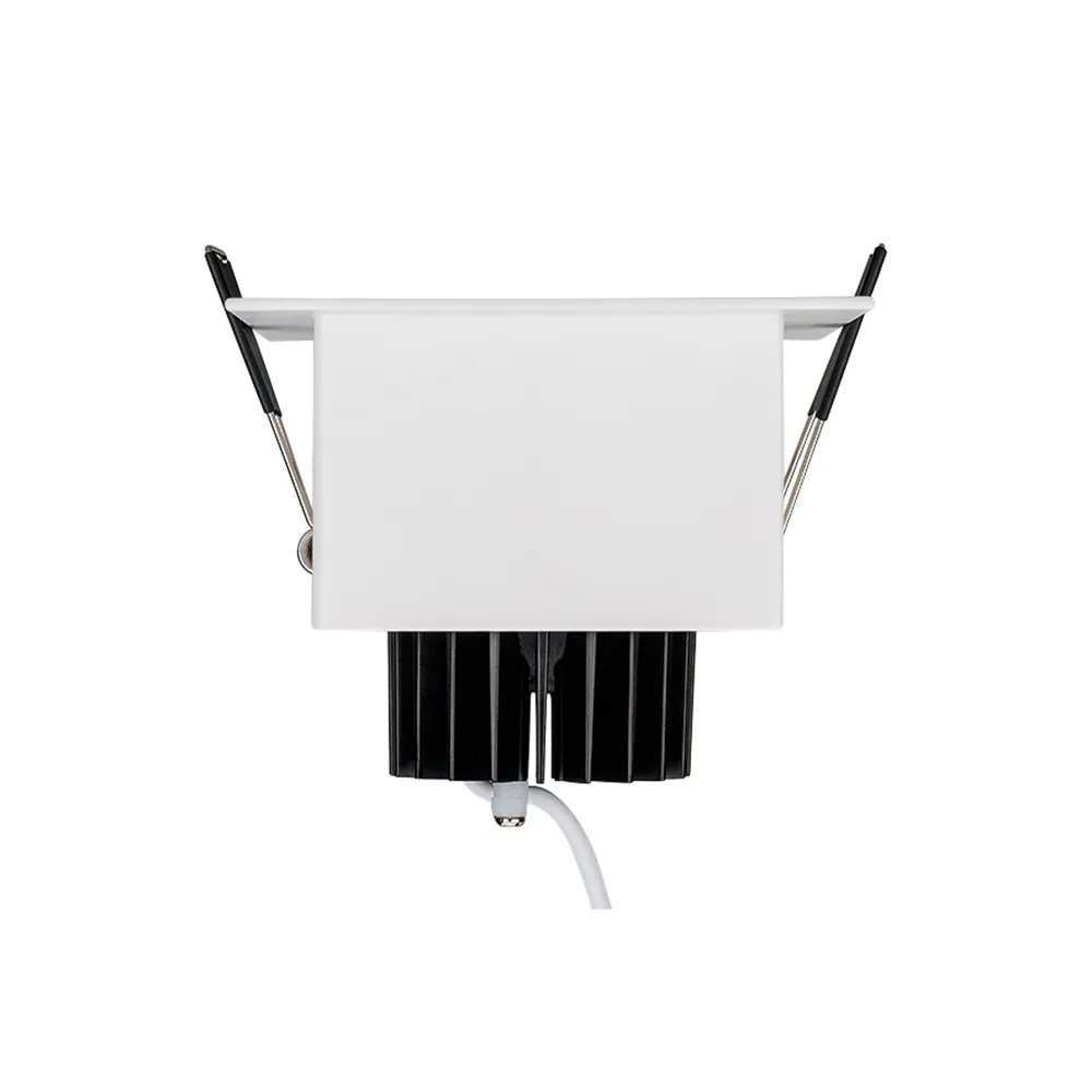 Встраиваемый карданный светильник. Угол 38° / 9Вт / ТЕПЛЫЙ БЕЛЫЙ 3000K / 680лм, CRI>80. Корпус из белого алюминия с черными вставками. Питание AC180-240V, 9Вт, в комплекте драйвер 200mA 30-45V. Размеры LxWxH: 102х102x85мм, отверстие для установки 85x85мм.
