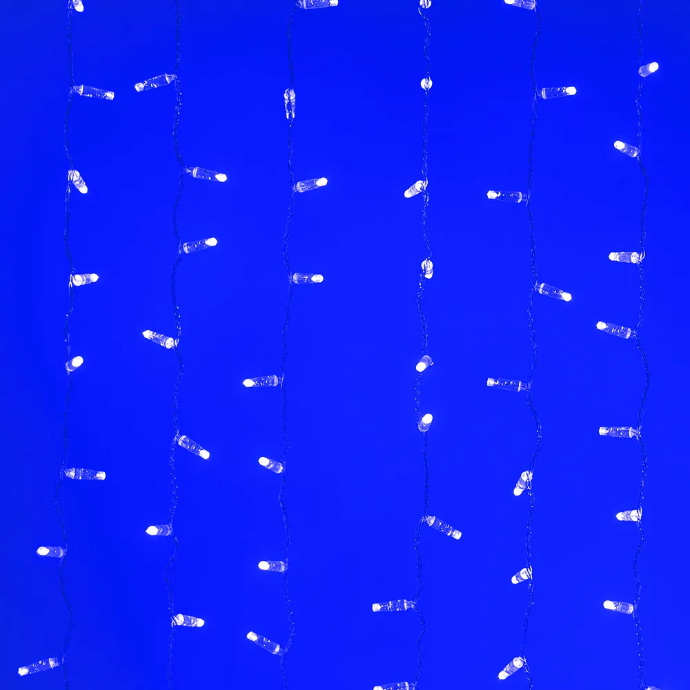 Светодиодный Занавес Classic. Размер 2000x3000 мм (длина 2000 мм, высота 3000 мм). 20 ниспадающих нитей длиной 3000 мм. 760 светодиодов размером 7 мм. Цвет свечения СИНИЙ, постоянное свечение и 8 динамических эффектов с резким световым рисунком (прозрачная вогнутая линза). Провод прозрачный, ПВХ. Питание 230 В, Мощность 60 Вт, защита IP65, применение в помещении и на улице под навесом. Аксессуар для подключения и выбора режима свечения в комплекте.