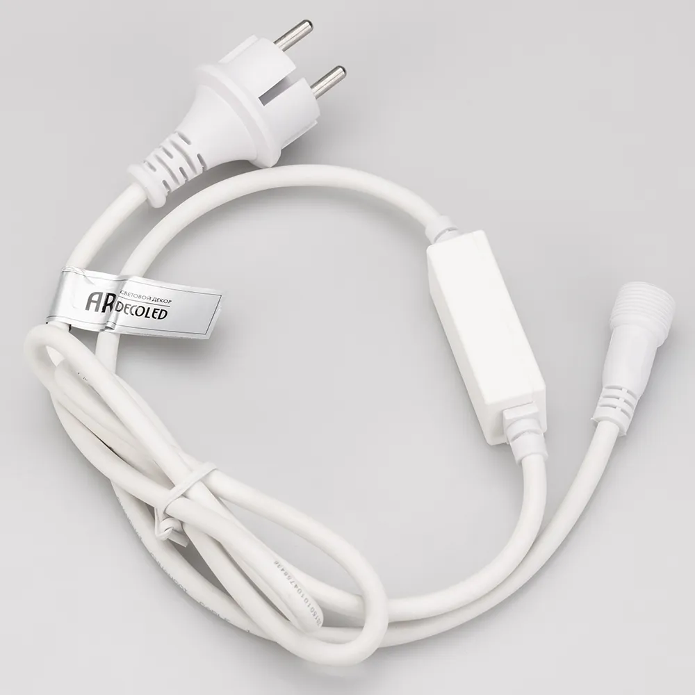 Шнур питания для светодиодных гирлянд с эффектом мерцания. Материал оболочки ПВХ. Цвет провода белый. В комплект входит: шнур питания с вилкой европейского стандарта (IP44), 2pin разъём подключения к гирлянде, выпрямитель AC/DC (1.6A). Длина провода 1.5 метра.