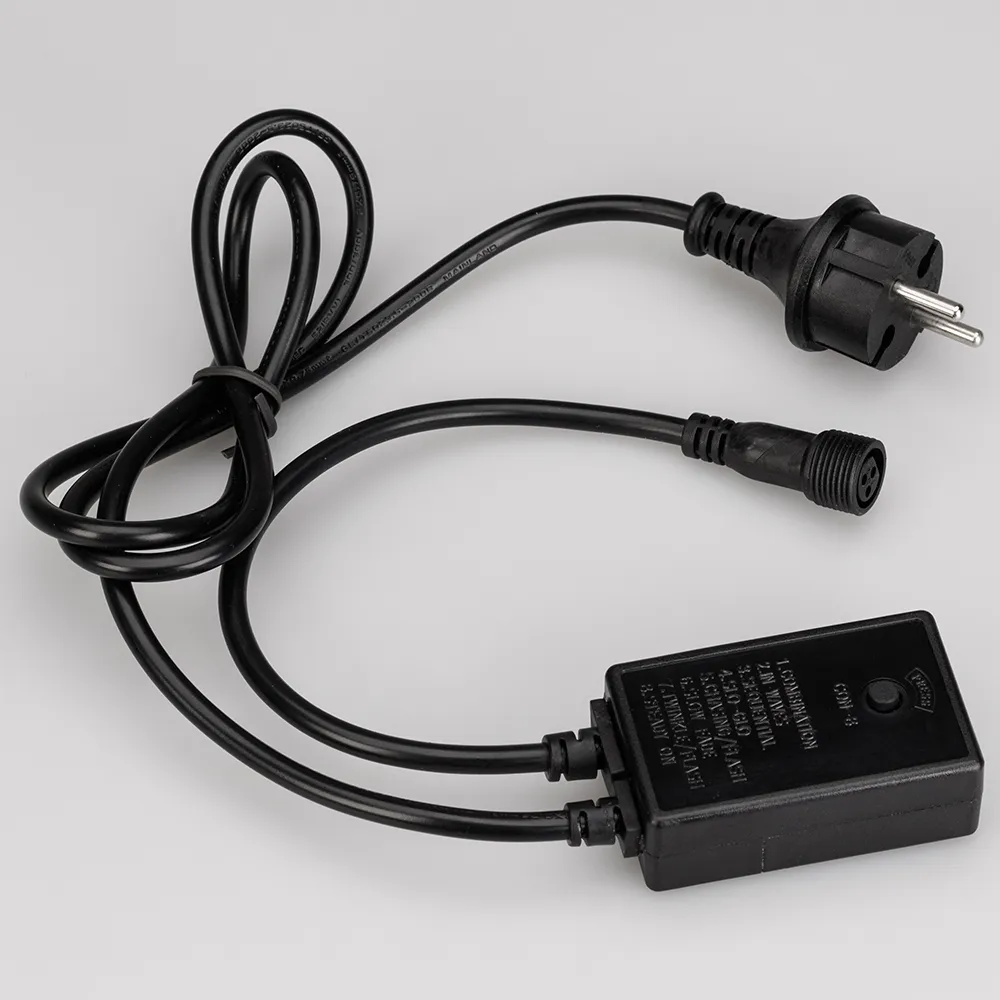 Контроллер для светодиодных гирлянд с эффектом динамики. Материал оболочки ПВХ. Цвет провода чёрный. В комплект входит: провод питания с вилкой европейского стандарта (IP44), 3pin разъём подключения к гирлянде, выпрямитель AC/DC (1.6A), контроллер для смены режимов динамического свечения (8 режимов). Длина провода 1.5 метра.
