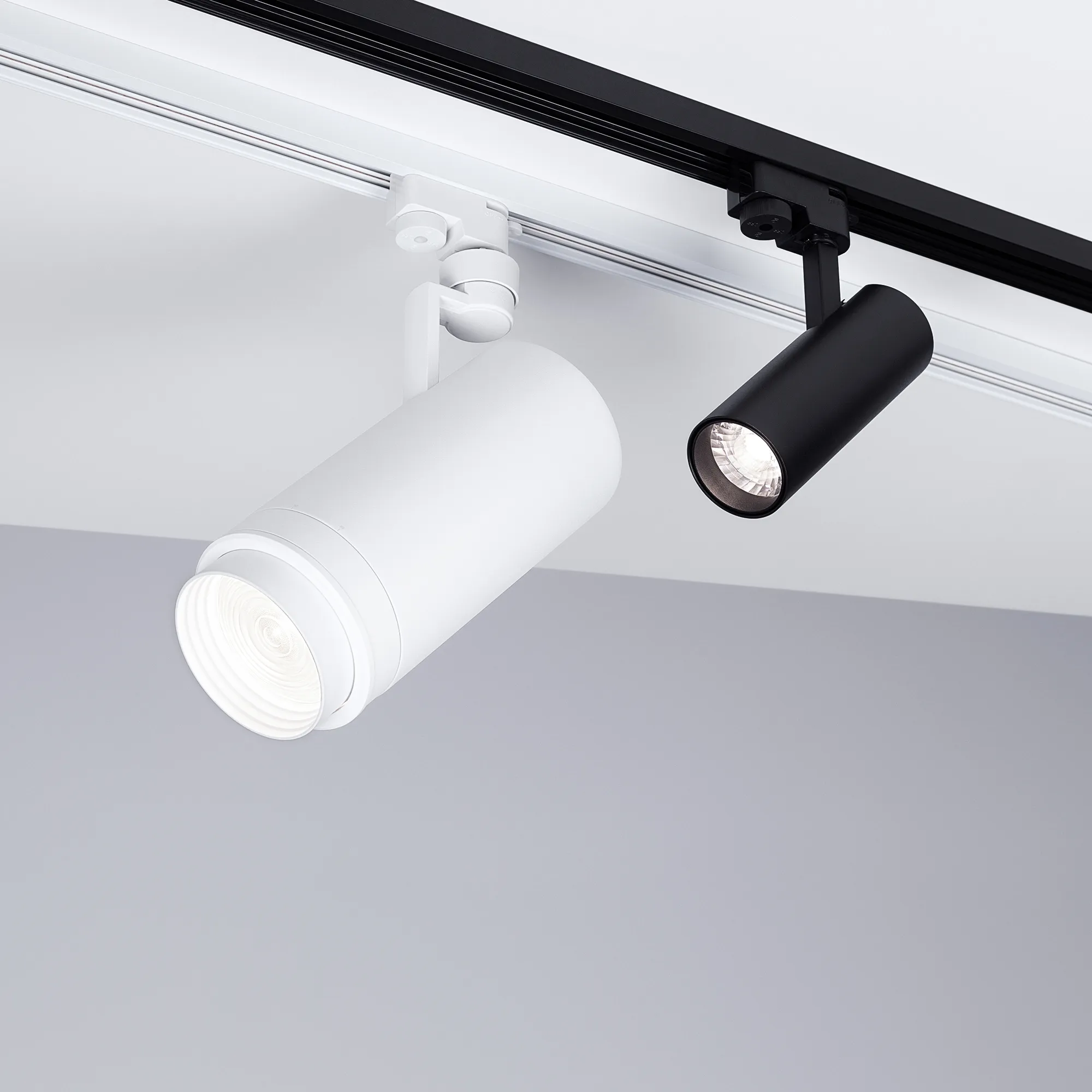 Светильник подвесной для треков/шин 2 провода. Мощность 20 Вт, св. поток 1800-2200 лм, 90 лм/Вт, белый 6000 K, CRI>90, угол 24°, напряжение питания 230 В. Черный круглый корпус из алюминия, материал линзы PMMA , степень защиты IP20. Размер: диаметр 74 мм, высота 160 мм. Монтаж на трек 1-фазный. Драйвер встроенный 30-42 В, 500 мА., пульсация <1%.