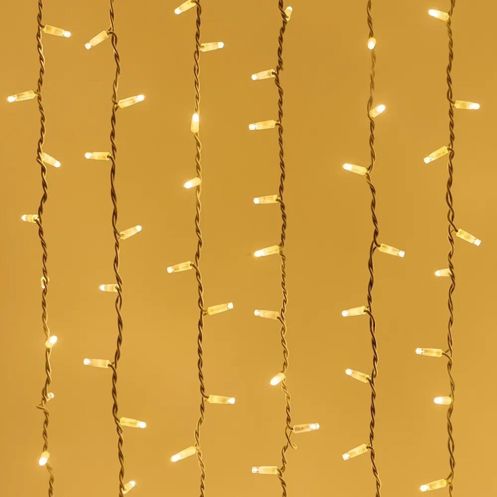 Светодиодный Занавес Pro. Размер 2000x3000 мм (длина 2000 мм, высота 3000 мм). 20 ниспадающих нитей длиной 3000 мм. 760 светодиодов размером 7 мм. Цвет свечения ТЕПЛЫЙ БЕЛЫЙ (3000 К), постоянное свечение и 8 динамических эффектов с резким световым рисунком (прозрачная вогнутая линза). Провод белый, каучук. Питание 230 В, Мощность 70 Вт, защита IP65, применение в помещении и на улице под навесом. Аксессуар для подключения и выбора режима свечения в комплекте.