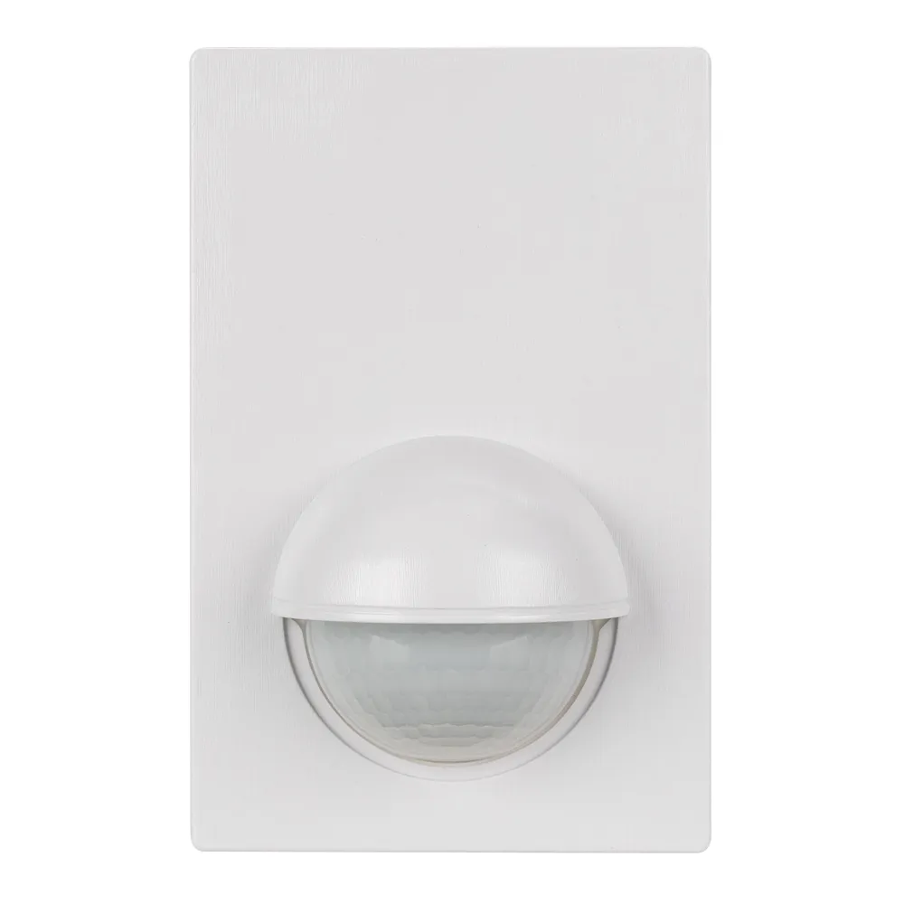 Настенный накладной датчик движения, совмещенный с датчиком освещенности, регулировка времени (10с–15мин), расстояния (до 12 м), освещенности (3-2000люкс), нагрузка 300 Вт (для энергосберегающих и светодиодных ламп), нагрузка 1200 Вт (для ламп накаливания), цвет белый, размеры 120x78x28мм, вес 166 г. Высота установки 1,8-2,5м.