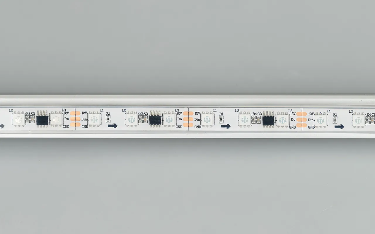 Герметичная лента «Бегущие огни» с драйвером 16703, в запрессованном силиконе, литая силиконовая трубка IP67, со СКОТЧЕМ 3M на обрат. стороне. Рекоменд-ся подводка пит-я с 2 сторон ленты. Длина 5м, 300шт LED RGB 5060, 20 pixel/m (1 pixel = 3 LED). Управление от внешнего контроллера SPI, без авторежима. Питание 12V, макс. мощн-ть 14,4 Вт/м (статический белый цвет). Ширина 12 мм. Герметичные круглые коннекторы.