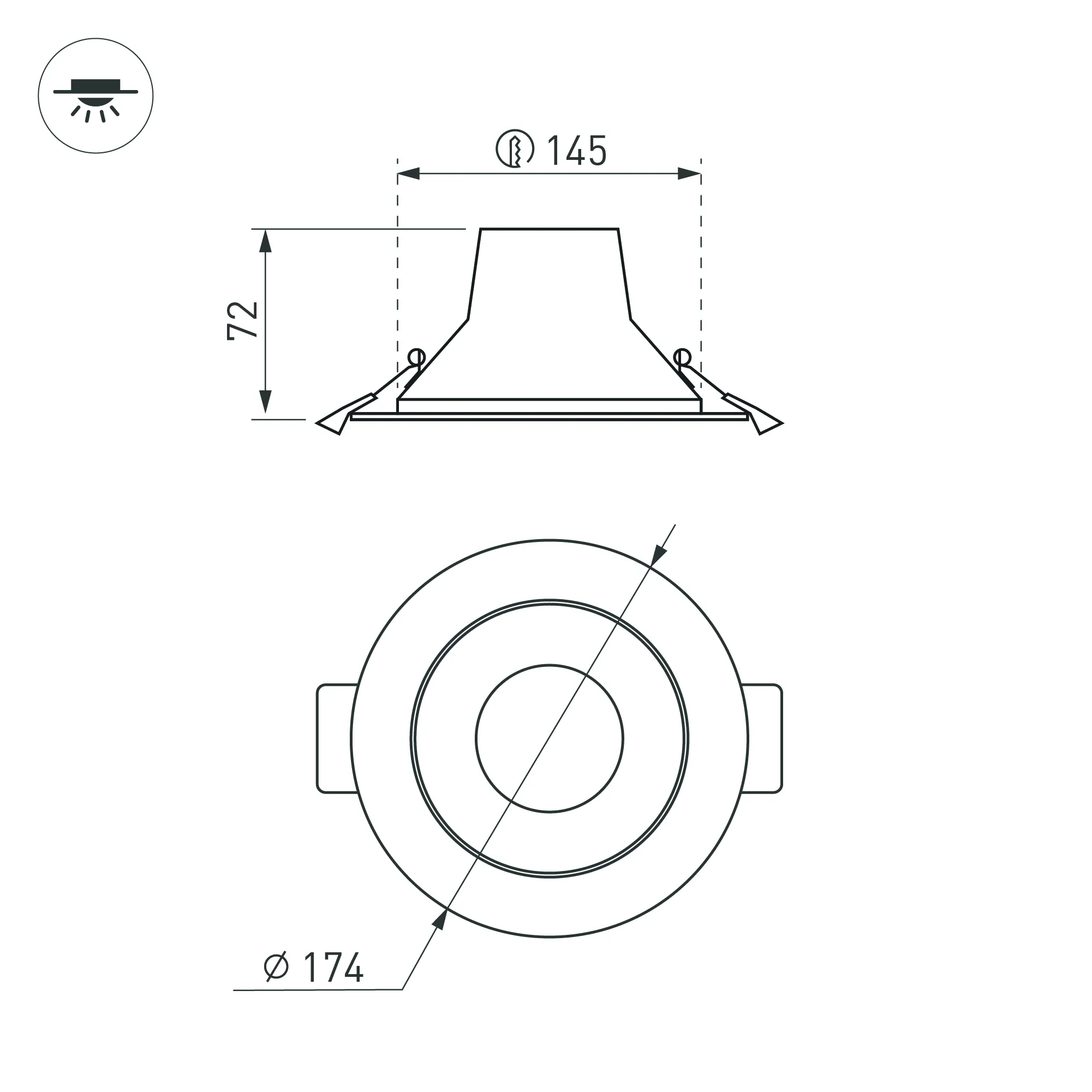 Светильник даунлайт с изменяемой цветовой температурой и переключателем на корпусе. Мощность 20 Вт, св. поток 2439-2517 лм, 100 лм/Вт, белый 6000К, или дневной 4000К, или теплый 3000К (выбор цвета свечения при установке, фиксированный), CRI>80, угол 80°, напряжение питания 230 В. Белый круглый корпус из алюминия, степень защиты IP20. Размер: диаметр 174 мм, высота 72 мм. Монтаж встраиваемый, установочное отверстие: диаметр 145-155 мм. Драйвер 18-30 В, 700 мА, пульсация <0,7%.