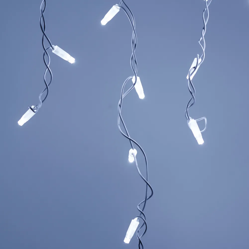 Светодиодная бахрома Pro. Размер 4000 мм (длина 4000 мм, по длине 32 нити высотой 200/600 мм). Количество светодиодов 128 шт размером 7 мм. Основной цвет свечения БЕЛЫЙ (6000 К), эффект мерцания редких точек БЕЛЫЙ (6000К) с мягким световым рисунком (выпуклая молочно-белая линза), соотношение светодиодов: 106 теплых постоянного свечения / 22 белых с мерцанием. Эффект частого мерцания. Провод белый, каучук. Питание 230 В, Мощность 6 Вт, защита IP65, применение на улице под навесом. Аксессуары для подключения приобретаются отдельно.