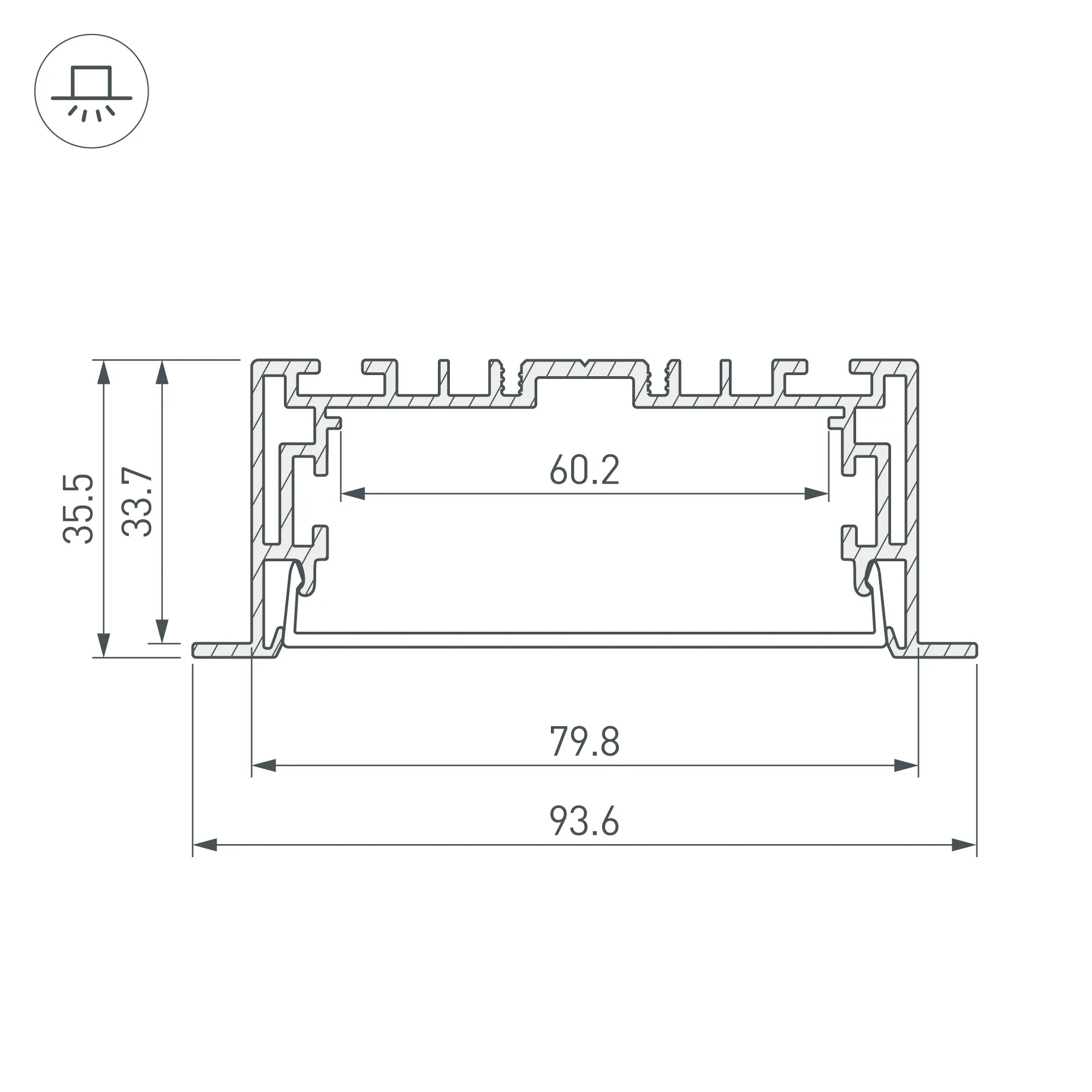 Комплект с экраном. Алюминиевый анодированный профиль для светодиодных лент и линеек. Габаритные размеры (L×W×H): 2500x94x35 мм. В комплекте профиль, PC матовый экран. Ширина площадки для ленты 60,2 мм. Светопропускание экрана 85%. Аксессуары приобретаются отдельно.