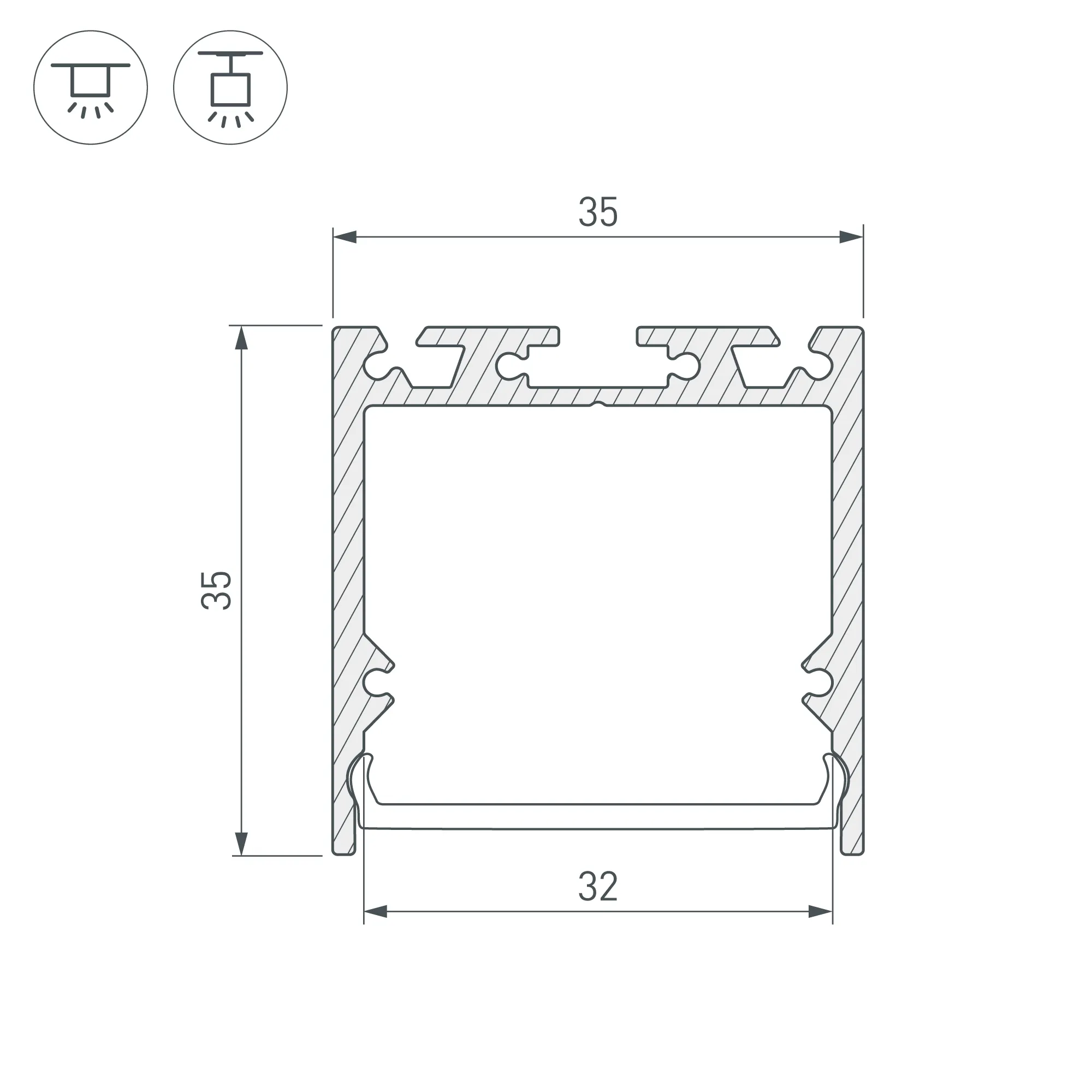 Алюминиевый анодированный профиль для светодиодных лент и линеек. Габаритные размеры (L×W×H): 3000x35x35 мм. Ширина площадки для ленты 31 мм. Экраны, заглушки и другие аксессуары приобретаются отдельно. Цена за 1 метр.