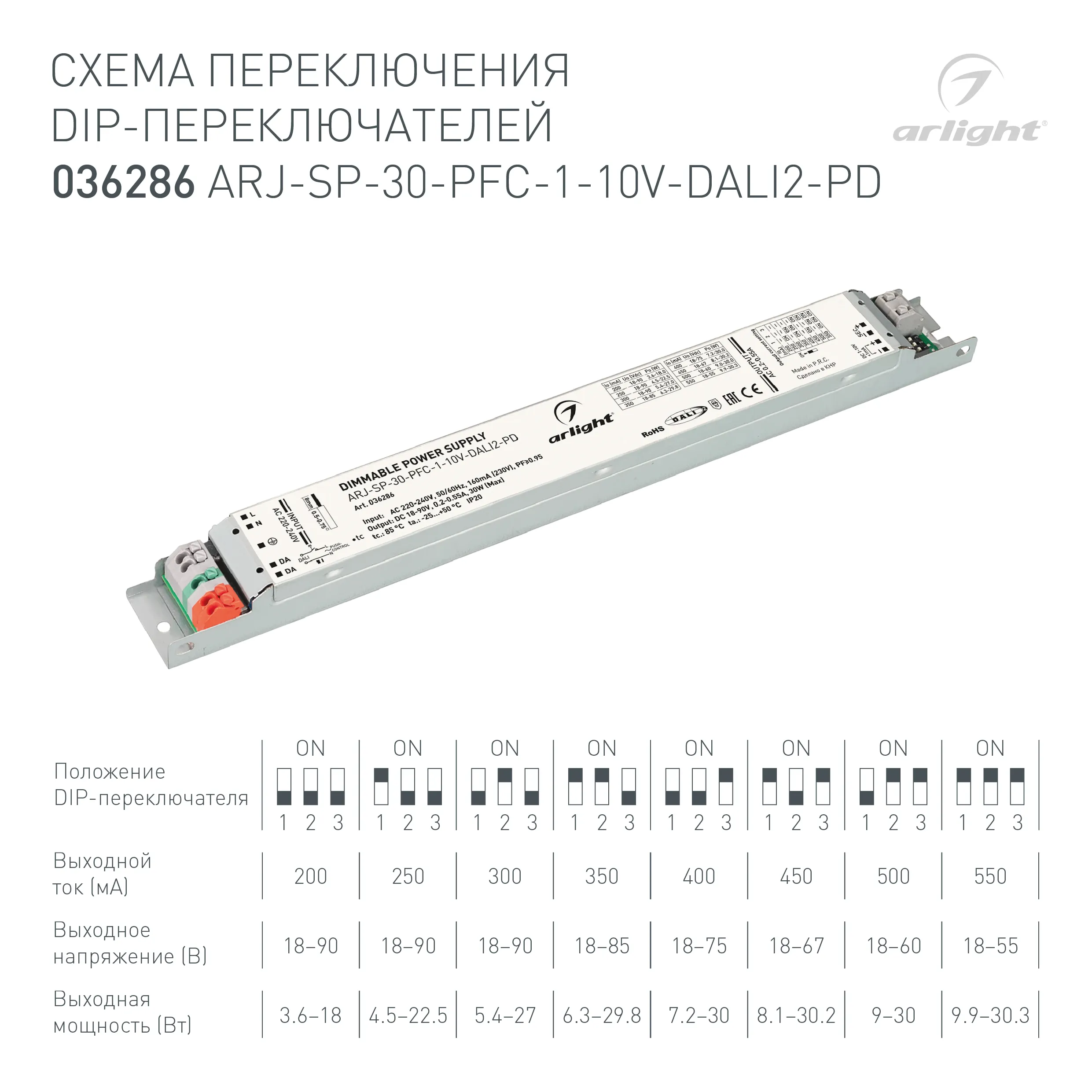 Блок питания ARJ-SP-30-PFC-1-10V-DALI2-PD (30W, 18-90V, 0.2-0.55A) (Arlight, IP20 Металл, 5 лет)