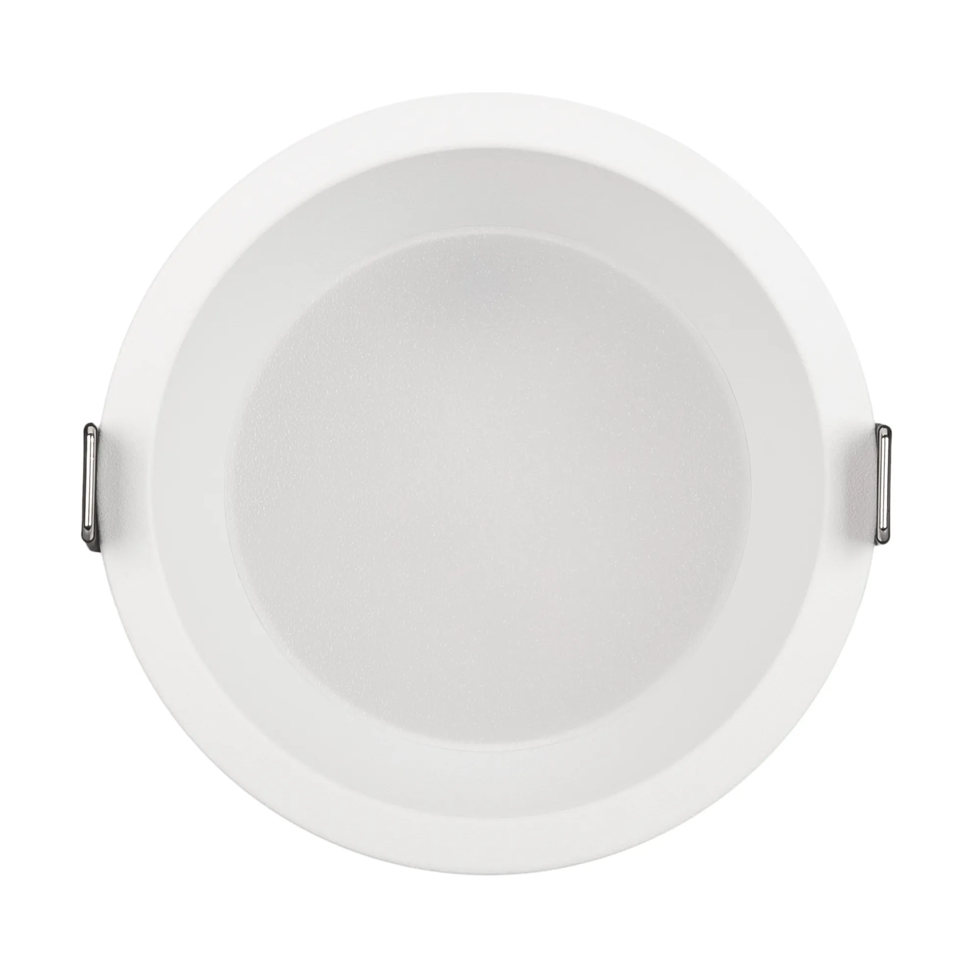 Встраиваемый светильник даунлайт. Мощность 12 Вт, св. поток 840 лм, 70 лм/Вт, тёплый 3000 K, CRI>90, угол 90°, напряжение питания 230 В. Белый круглый корпус из алюминия, степень защиты IP20. Размер: диаметр 104 мм, высота 55 мм. Монтаж встраиваемый, установочное отверстие: диаметр 95 мм. Драйвер 27-42 В, 300 мА, пульсация <2%.