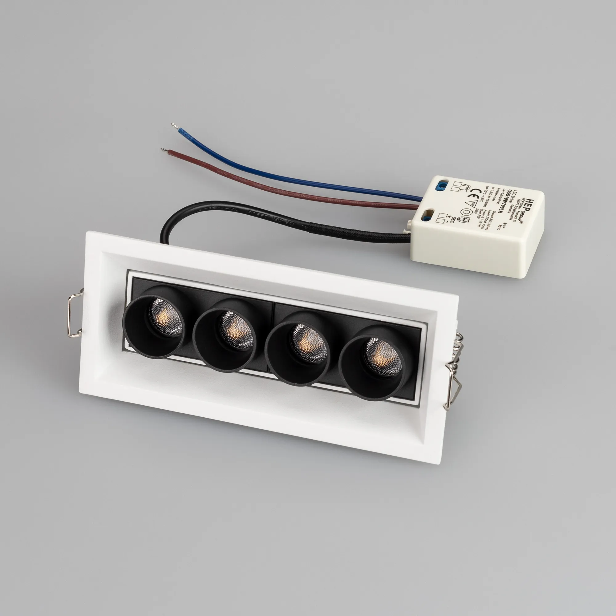 Встраиваемый поворотный светильник. Мощность 10 Вт, св. поток 734 лм, 75 лм/Вт, дневной 4000 K, CRI>98, угол 30°, напряжение питания 230 В. Чёрный прямоугольный корпус из алюминия, экран PMMA, степень защиты IP20. Размер: длина 150 мм, ширина 67 мм, высота 50 мм. Монтаж встраиваемый, установочное отверстие длина 145 мм, ширина 60 мм. Драйвер 9-14 В, 700 мА, пульсация <1%.