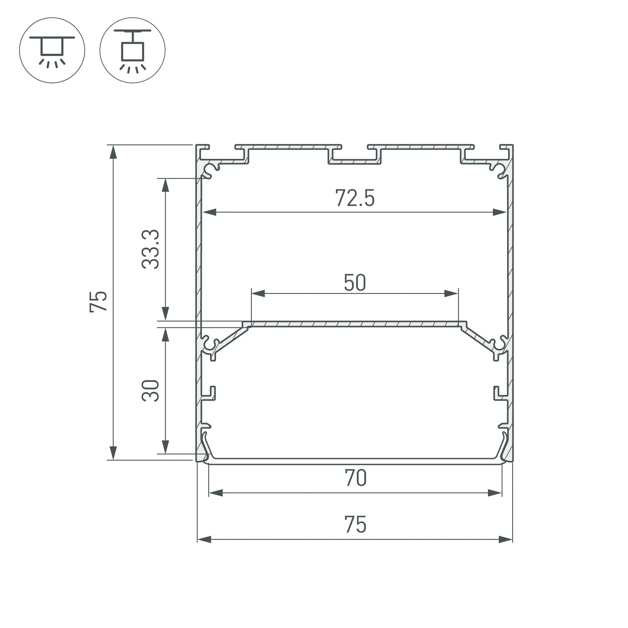 Алюминиевый анодированный профиль для светодиодных лент и линеек. Цвет - белый RAL9003 (порошковая окраска). Габаритные размеры (L×W×H): 3000x75x75 мм. Ширина площадки для ленты 50 мм. Отсек для БП 72,5х33,3 мм. Экраны, заглушки и другие аксессуары приобретаются отдельно. Цена за 1 метр.