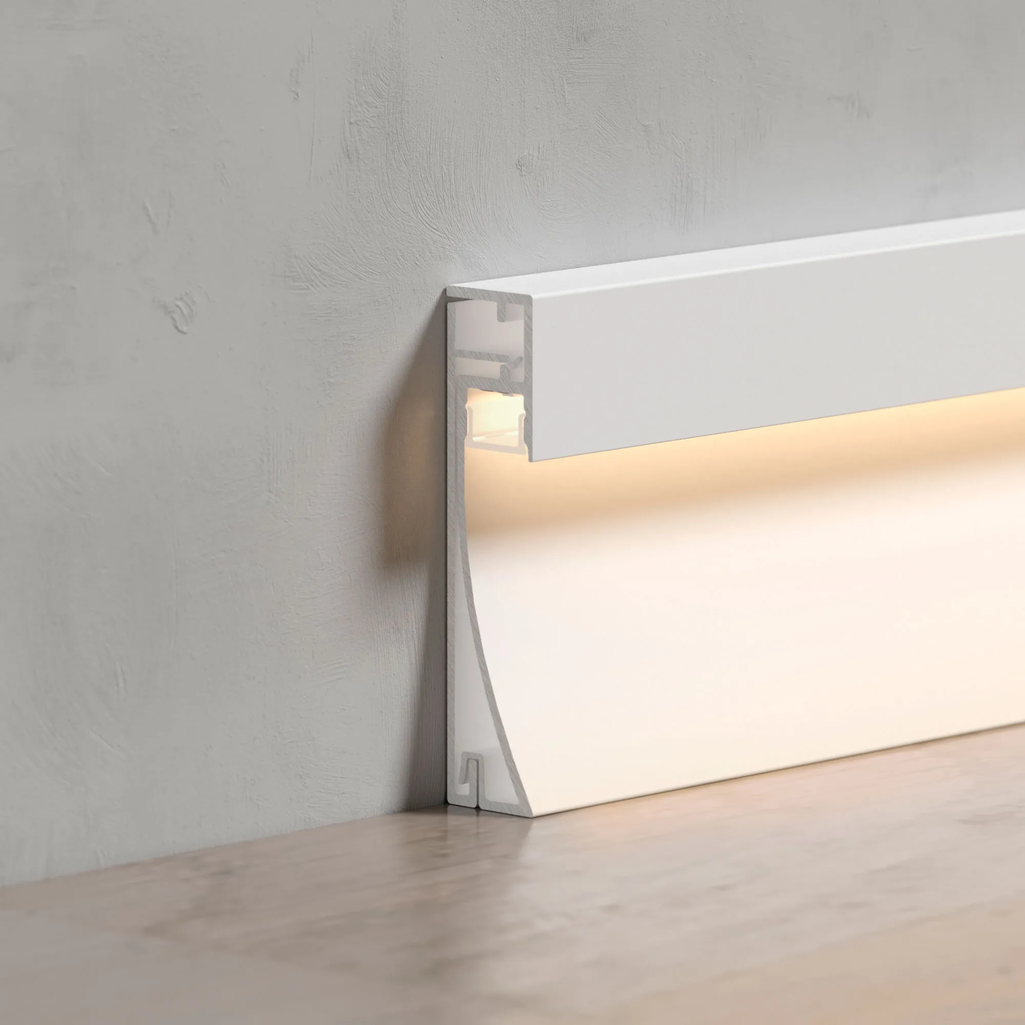 Алюминиевый накладной двухкомпонентный профиль-плинтус для светодиодных лент и линеек. Цвет - белый RAL9003 (порошковая окраска). Габаритные размеры (L×W×H): 2000x12,2x53,3 мм. Ширина площадки для ленты 8 мм. Аксессуары приобретаются отдельно. Цена за метр.