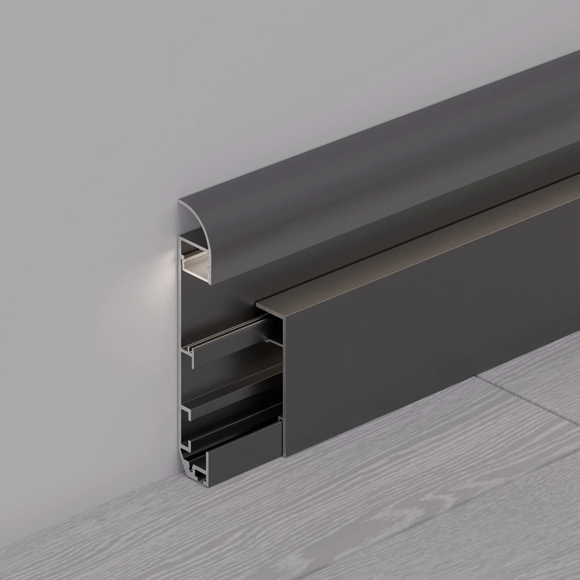 Алюминиевый накладной двухкомпонентный профиль-плинтус для светодиодных лент и линеек. Цвет - черный RAL9005 (порошковая окраска). Габаритные размеры (L×W×H): 2000x14,8x79,7 мм. Ширина площадки для ленты 12,2 мм. Аксессуары приобретаются отдельно. Цена за метр.