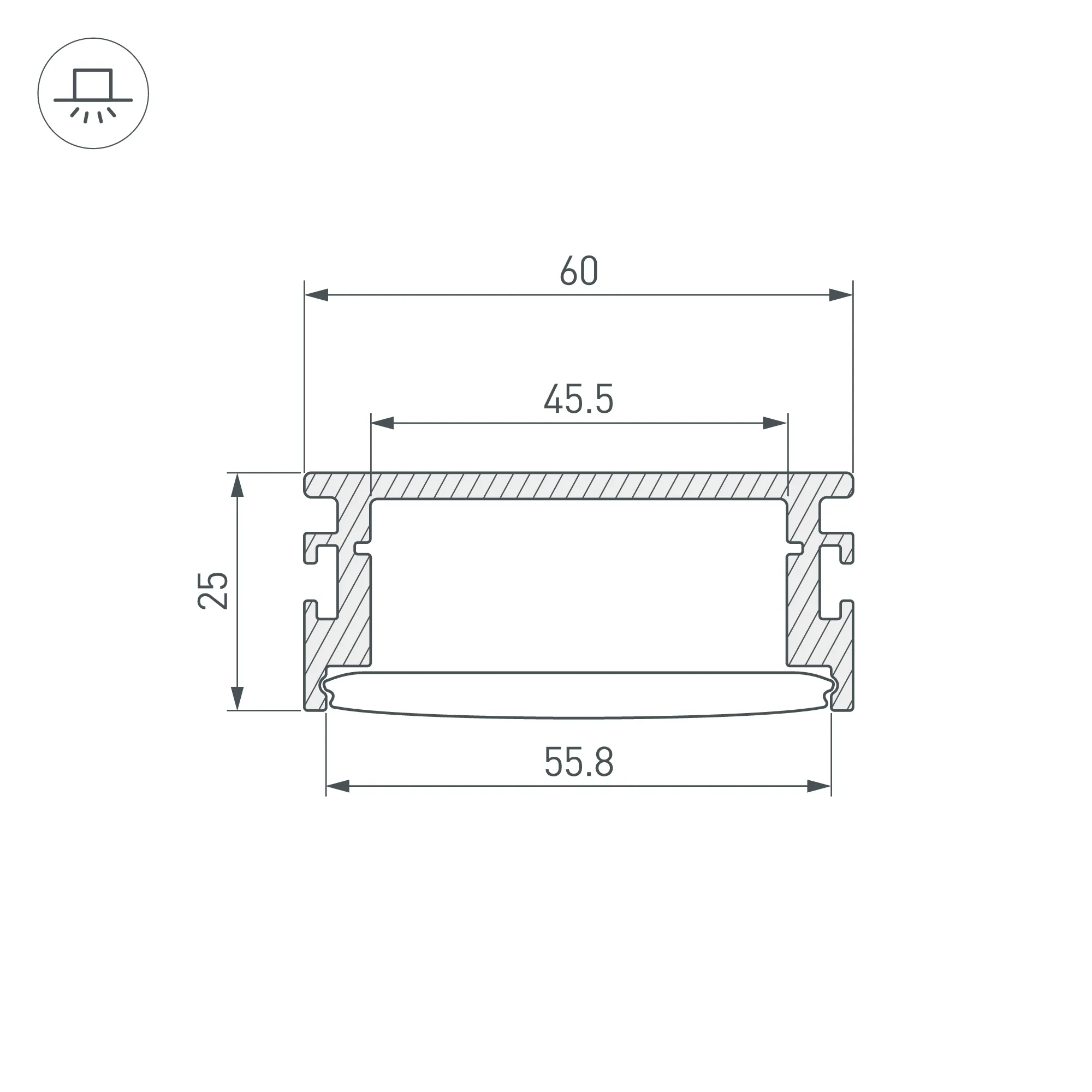 Алюминиевый анодированный встраиваемый профиль для пола. Возможность герметизации до IP65 (при использовании силиконового клея для фиксации экрана и заглушек), IK10 (08-10). Габаритные размеры (L×W×H): 3000x60x25,8 мм. Ширина площадки для ленты 45,5 мм. Заглушки и экран приобретаются отдельно. Цена за 1 метр.