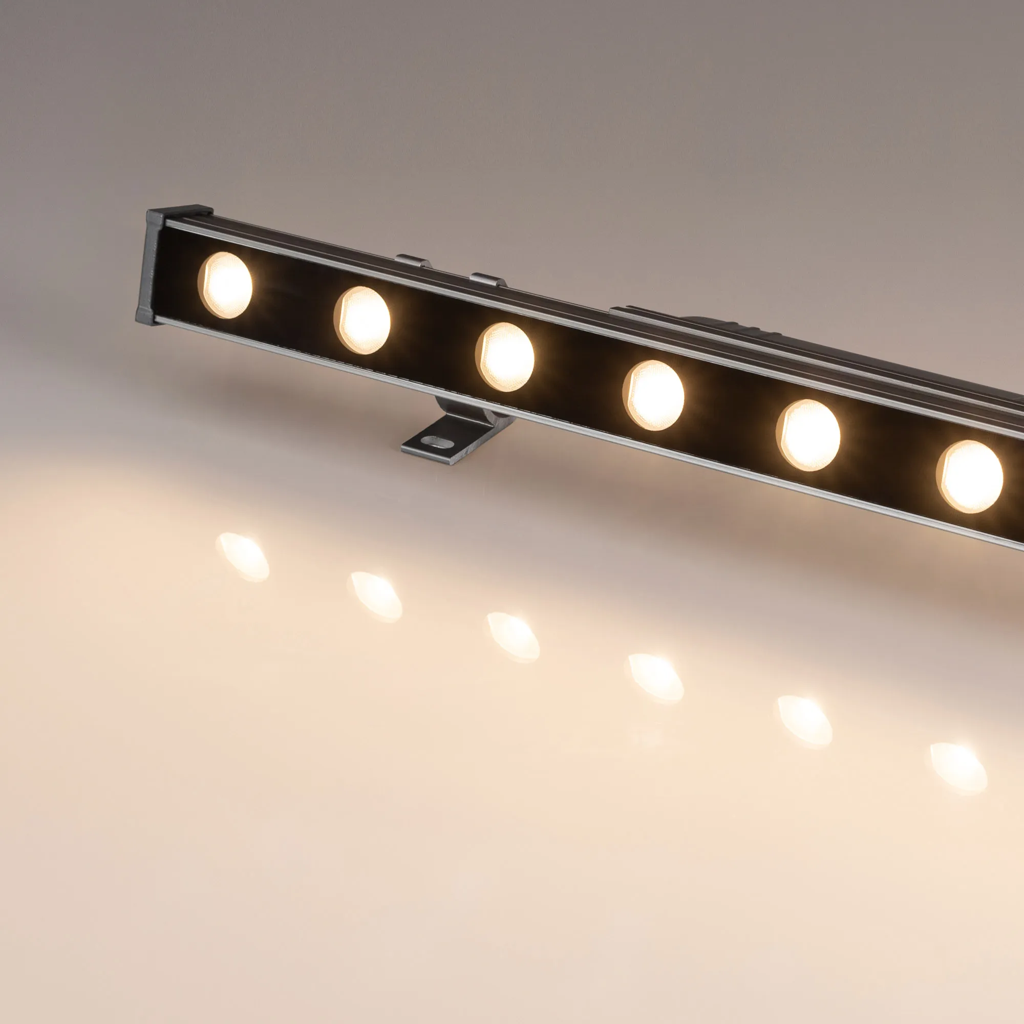 Линейный прожектор. Мощность 9 Вт, св. поток 900 лм, 100 лм/Вт, теплый 3000 K, CRI>80, угол 30°, напряжение питания 230 В. Серый прямоугольный корпус из алюминия, экран стекло, степень защиты IP65. Размер: длина 500 мм, ширина 40 мм, высота 30 мм. Монтаж на кронштейнах.
