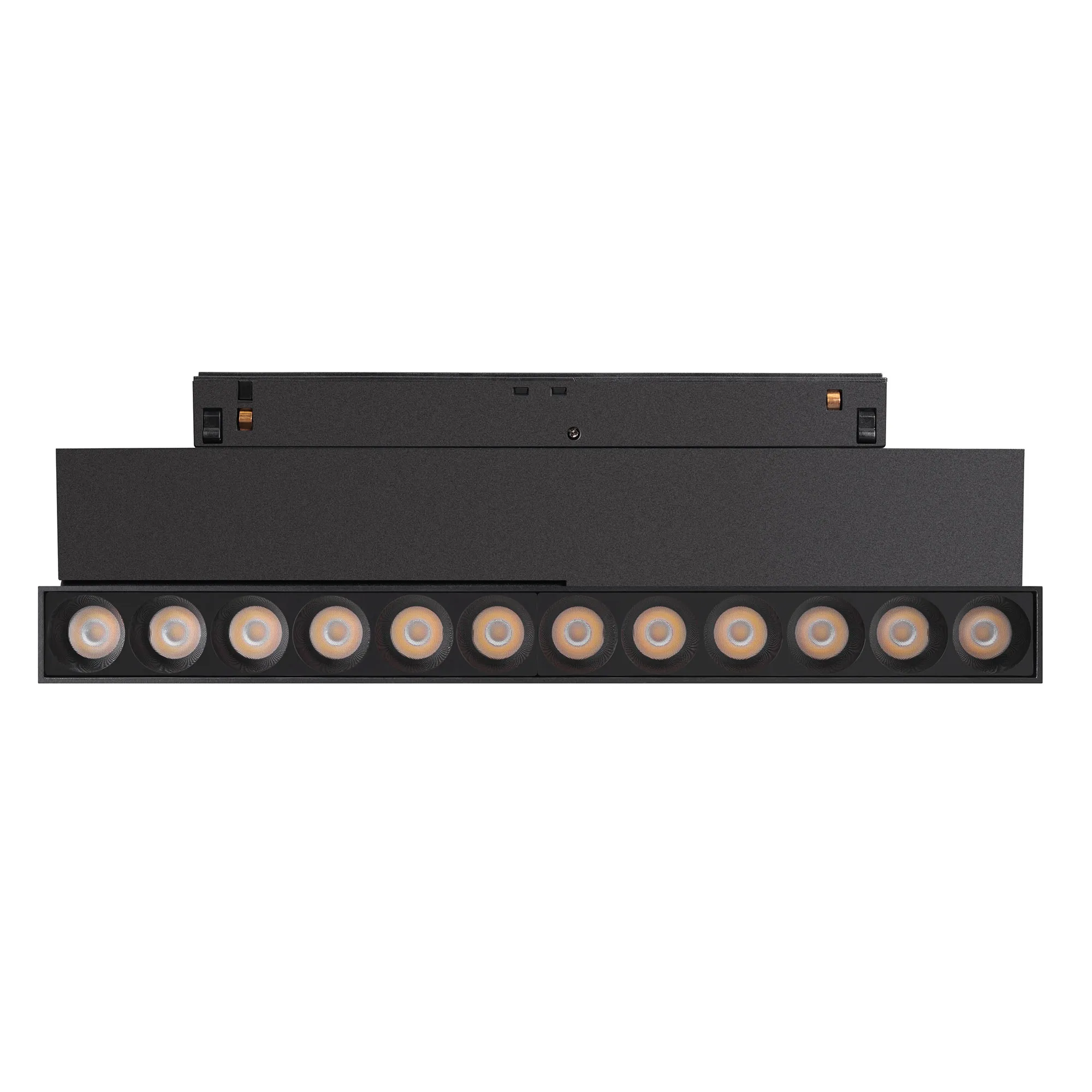 Светильник для магнитных треков MAG-ORIENT шириной 26 мм с управлением TUYA (Wi-Fi) и изменяемой цветовой температурой. Мощность 12 Вт, св. поток 770-950 лм, 64-79 лм/Вт, изменяемая цветовая температура 2700-6500 K, CRI>90, угол 30°, напряжение питания 48 В. Черный прямоугольный корпус из металл, экран поликарбонат, степень защиты IP20. Размер: длина 232 мм, ширина 23 мм, высота 99 мм. Монтаж на трек MAG-ORIENT. Пульсация <1%. Работает с голосовыми помощниками (Алиса, Маруся и т.д.)