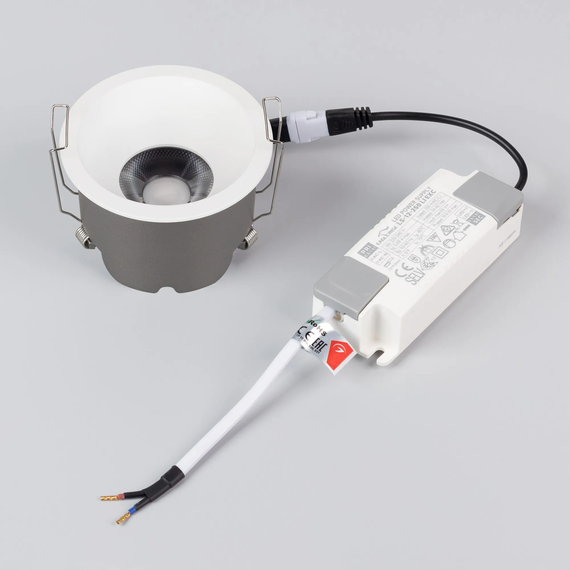 Встраиваемый светильник даунлайт. Мощность 10 Вт, св. поток 980 лм, 98 лм/Вт, дневной 4000 K, CRI>90, угол 24°, напряжение питания 230 В. Белый круглый корпус из алюминия, степень защиты IP20. Размер: диаметр 82 мм, высота 53 мм. Монтаж встраиваемый, установочное отверстие: диаметр 75 мм. UGR<14. Драйвер 30-42 В, 250 мА, пульсация <2%.