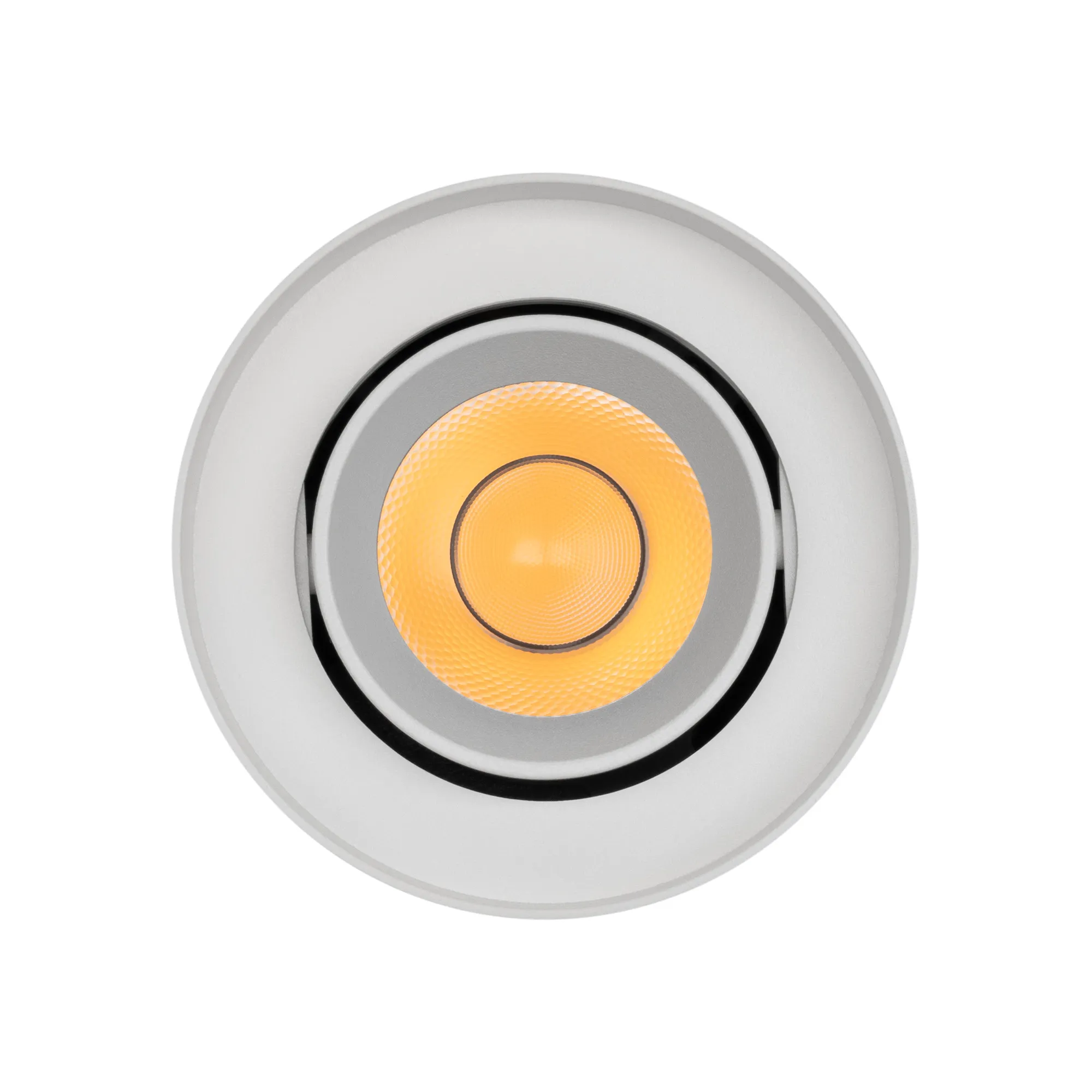 Накладной интерьерный светильник. Мощность 10 Вт, св. поток 970 лм, 93 лм/Вт, теплый 3000 K, CRI>90, угол 15°, регулируемое направление луча 40° (20+20), поворотный световой модуль вокруг своей оси на 340°, UGR <18, напряжение питания 230 В. Белый круглый корпус из алюминия, степень защиты IP54. Размер: диаметр 86,5 мм, высота 120 мм. Монтаж накладной. Драйвер 27-43 В, 250 мА, пульсация <1%.