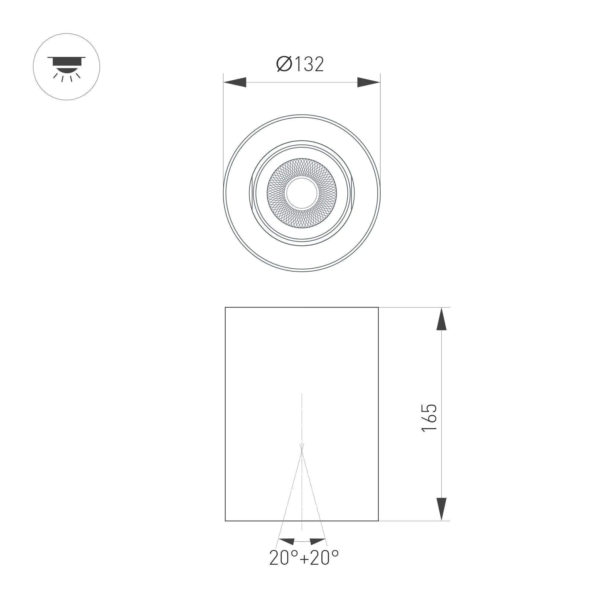 Накладной интерьерный светильник. Мощность 24 Вт, св. поток 2400 лм, 99 лм/Вт, теплый 3000 K, CRI>90, угол 24°, регулируемое направление луча 40°(20+20), поворотный световой модуль вокруг своей оси на 340°, UGR <11, напряжение питания 230 В. Чёрный круглый корпус из алюминия, степень защиты IP54. Размер: диаметр 132 мм, высота 165 мм. Монтаж накладной. Драйвер 27-45 В, 600мА, пульсация <1%.