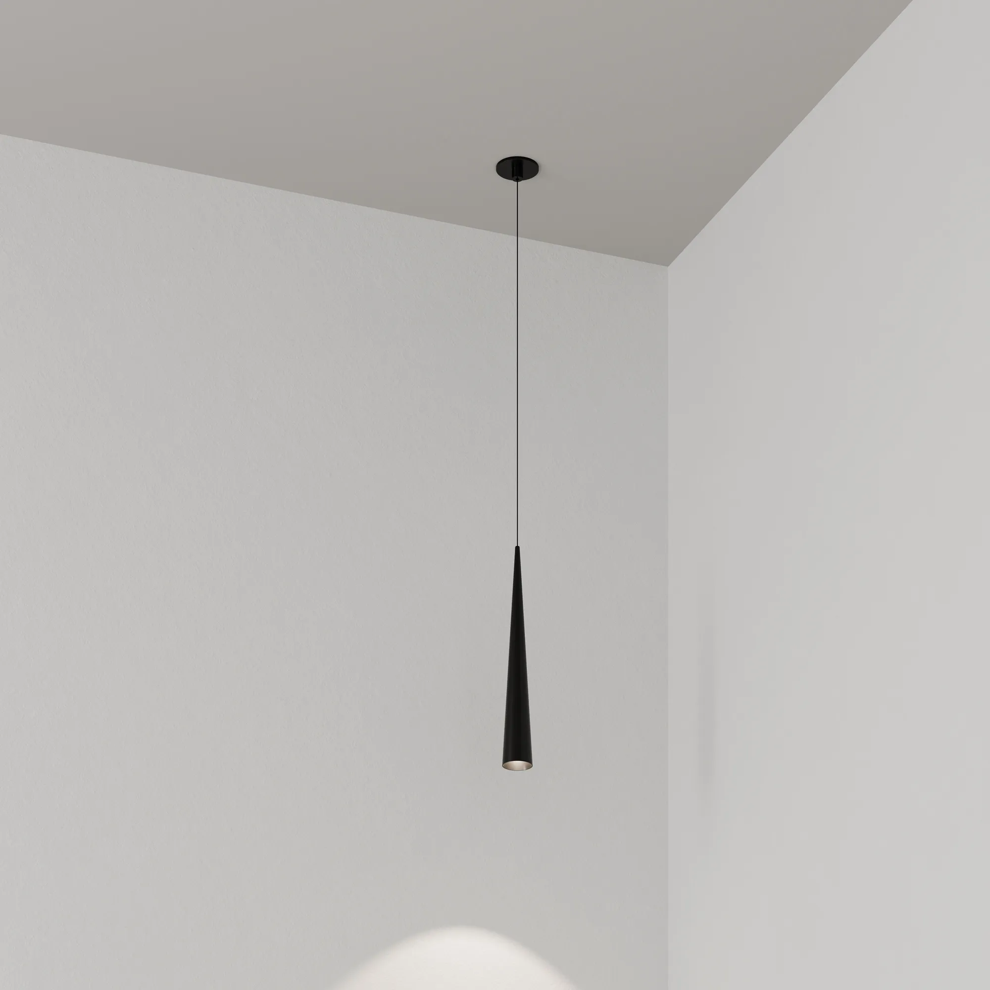Подвесной светильник. Мощность 5 Вт, св. поток 400 лм, световая эффективность 70 лм/Вт, теплый 2700 K, CRI>92, угол 36°, напряжение питания 230 В. Чёрный конусообразный вытянутый корпус из алюминия, линза из PMMA, степень защиты IP20. Размер: диаметр 57 мм, высота 400 мм. Монтаж подвесной, длина подвеса 2000 мм, регулируемая. В комплекте 2 вида чаш. Габариты встраиваемой чаши: Ø 80x41 мм. Габариты накладной чаши Ø80x60 мм. Драйвер 2,8-12В, 500 мА, пульсация <1%.