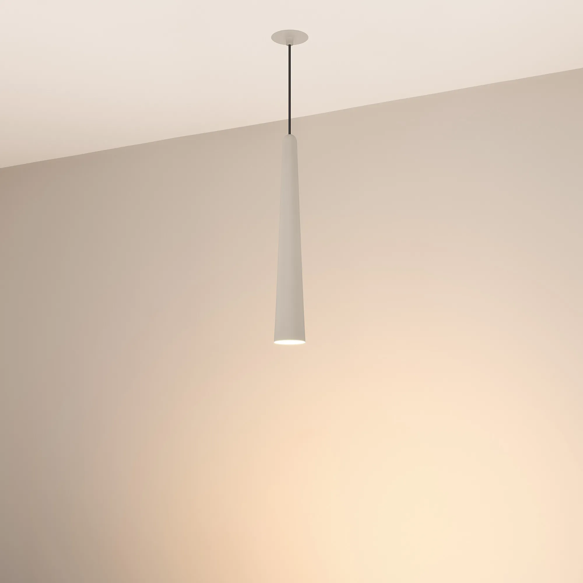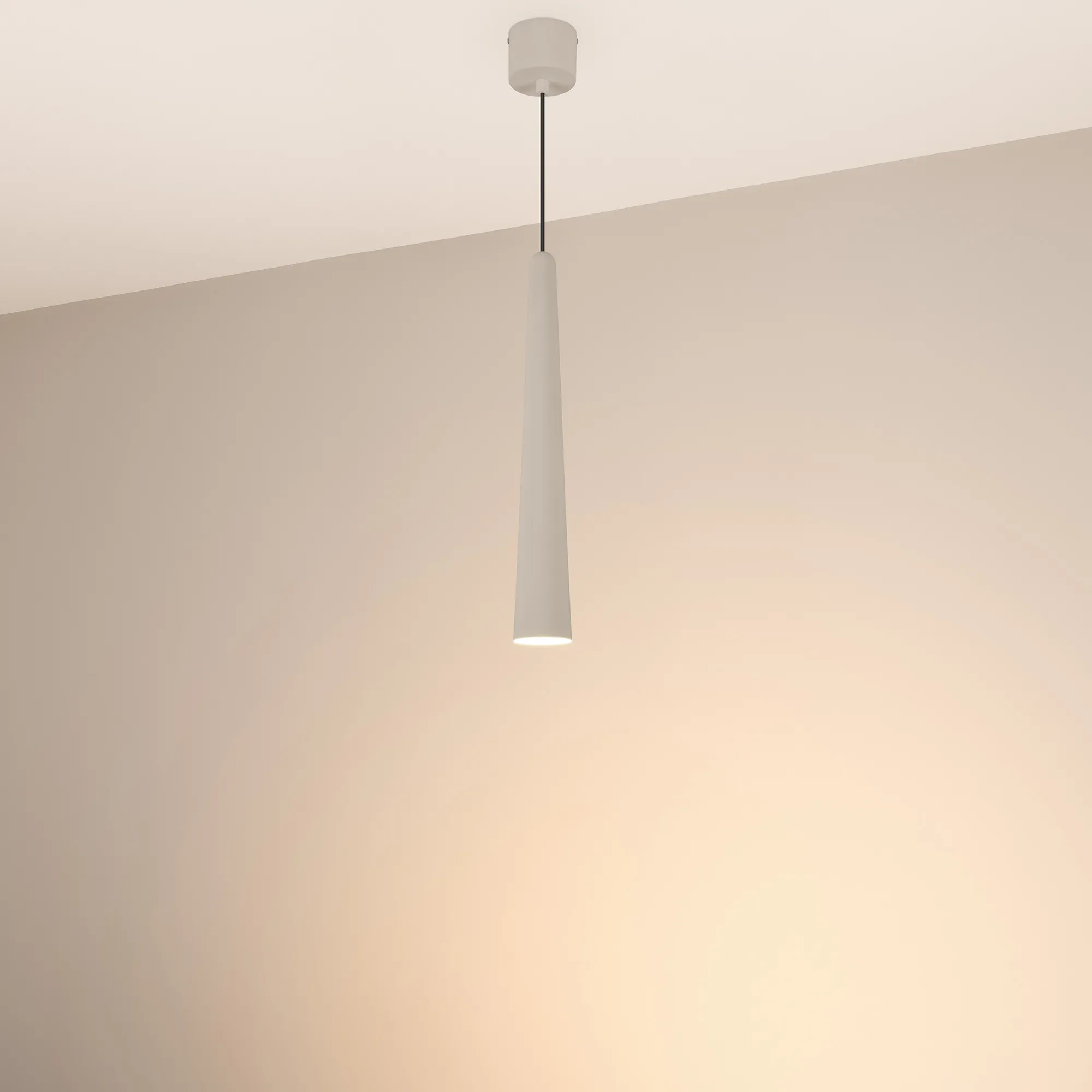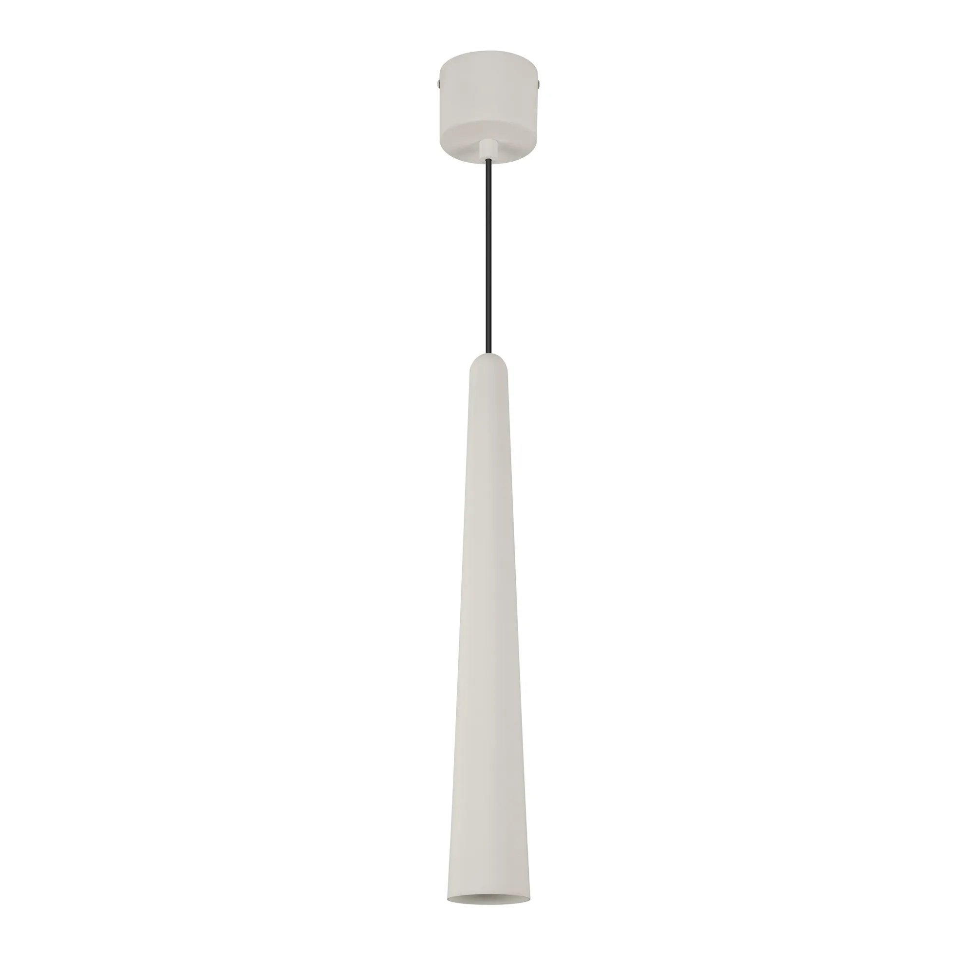 Подвесной светильник. Мощность 5 Вт, св. поток 400 лм, световая эффективность 70 лм/Вт, теплый 2700 K, CRI>92, угол 36°, напряжение питания 230 В. Светло - серый конусообразный вытянутый корпус из алюминия, линза из PMMA, степень защиты IP20. Размер: диаметр 57 мм, высота 400 мм. Монтаж подвесной, длина подвеса 2000 мм, регулируемая. В комплекте 2 вида чаш. Габариты встраиваемой чаши: Ø 80x41 мм. Габариты накладной чаши Ø80x60 мм. Драйвер 2,8-12В, 500 мА, пульсация <1%.