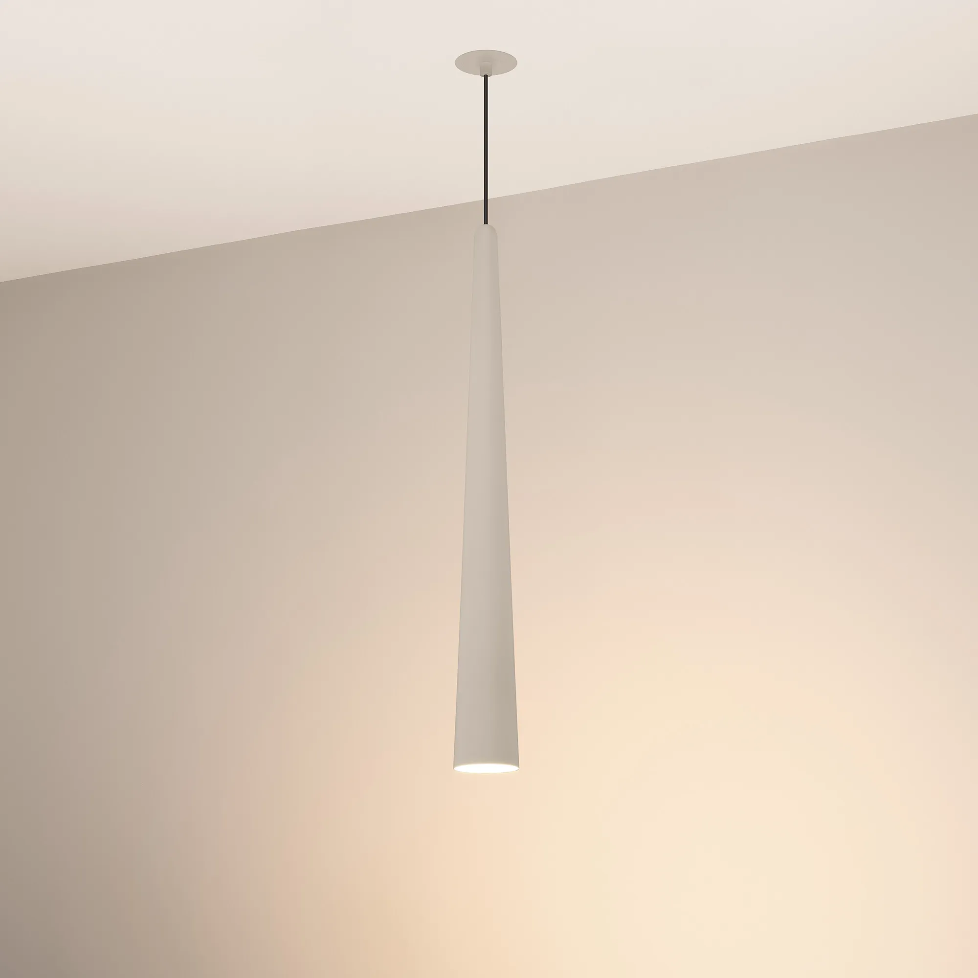 Подвесной светильник. Мощность 5 Вт, св. поток 400 лм, 70 лм/Вт, теплый 3000K, CRI>92, угол 36°, напряжение питания 230 В. Светло - серый конусообразный вытянутый корпус из алюминия, линза из PMMA, степень защиты IP20. Размер: диаметр 76 мм, высота 670мм. Монтаж подвесной, длина подвеса 2000 мм, регулируемая. В комплекте 2 вида чаш. Габариты встраиваемой чаши: Ø 80x41 мм. Габариты накладной чаши Ø80x60 мм. Драйвер 2,8-12В, 500 мА, пульсация <1%.
