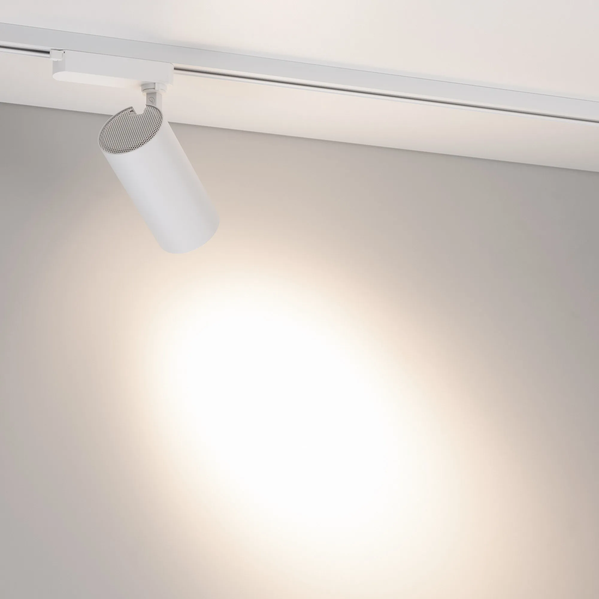 Светильник для треков/шин 2 провода. Мощность 20 Вт, св. поток без решетки honeycomb 2000 лм, 100 лм/Вт, с решеткой honeycomb 1320 лм, 66 лм/Вт, дневной 4000 K, CRI>90, угол 24°, напряжение питания 230 В. Белый круглый корпус из алюминия, материал линзы PMMA, степень защиты IP20. Размер: диаметр 74 мм, длина световой части 154 мм. Монтаж на трек 1-фазный. Драйвер встроенный 500 мА 25-40 В, пульсация <5%.