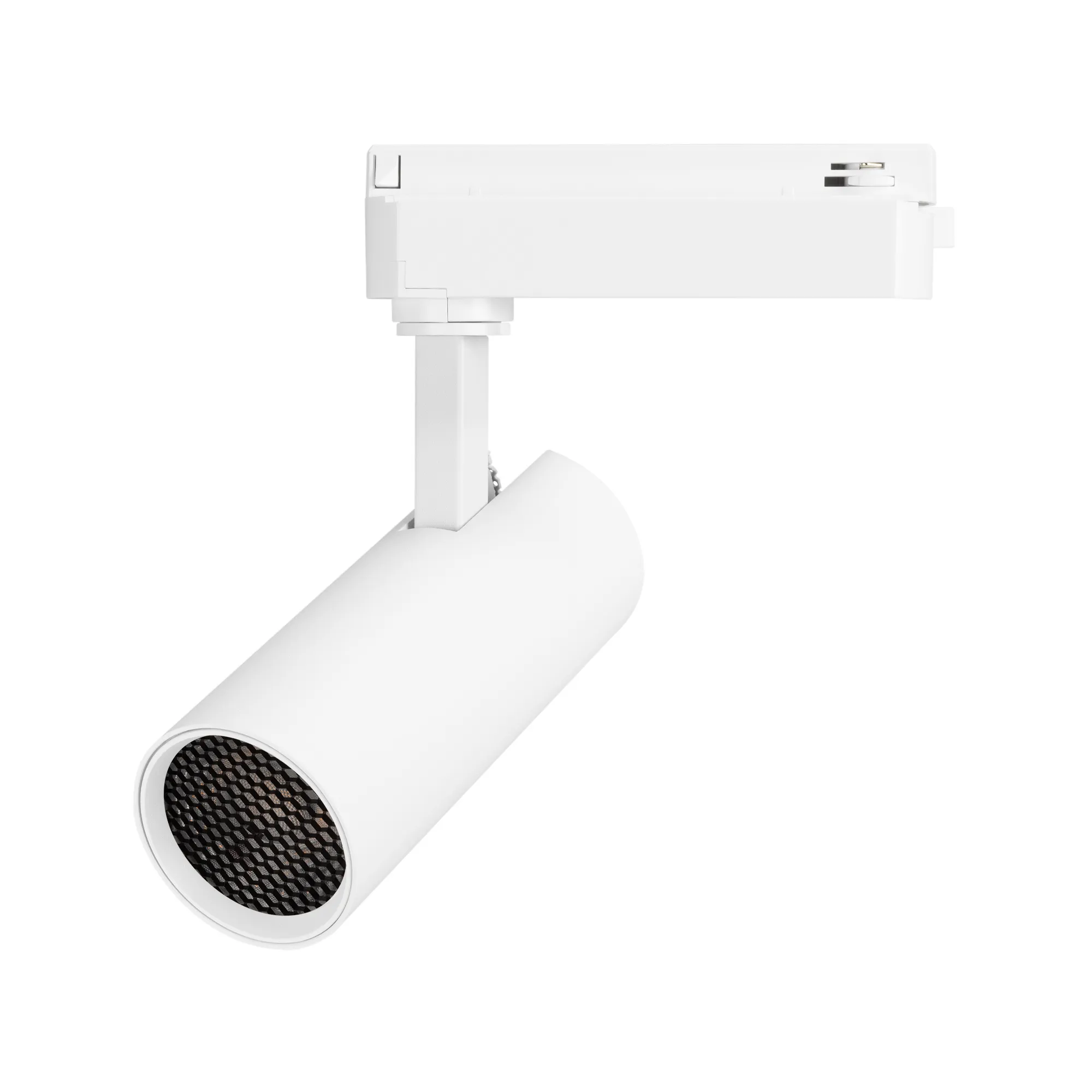 Светильник для треков/шин 2 провода. Мощность 15 Вт, св. поток без решетки honeycomb 1500 лм, 100 лм/Вт, с решеткой honeycomb 990 лм, 66 лм/Вт, тёплый 3000 K, CRI>90, угол 24°, напряжение питания 230 В. Белый круглый корпус из алюминия, материал линзы PMMA, степень защиты IP20. Размер: диаметр 60 мм, длина световой части 141 мм. Монтаж на трек 1-фазный. Драйвер встроенный 350 мА 25-40 В, пульсация <5%.