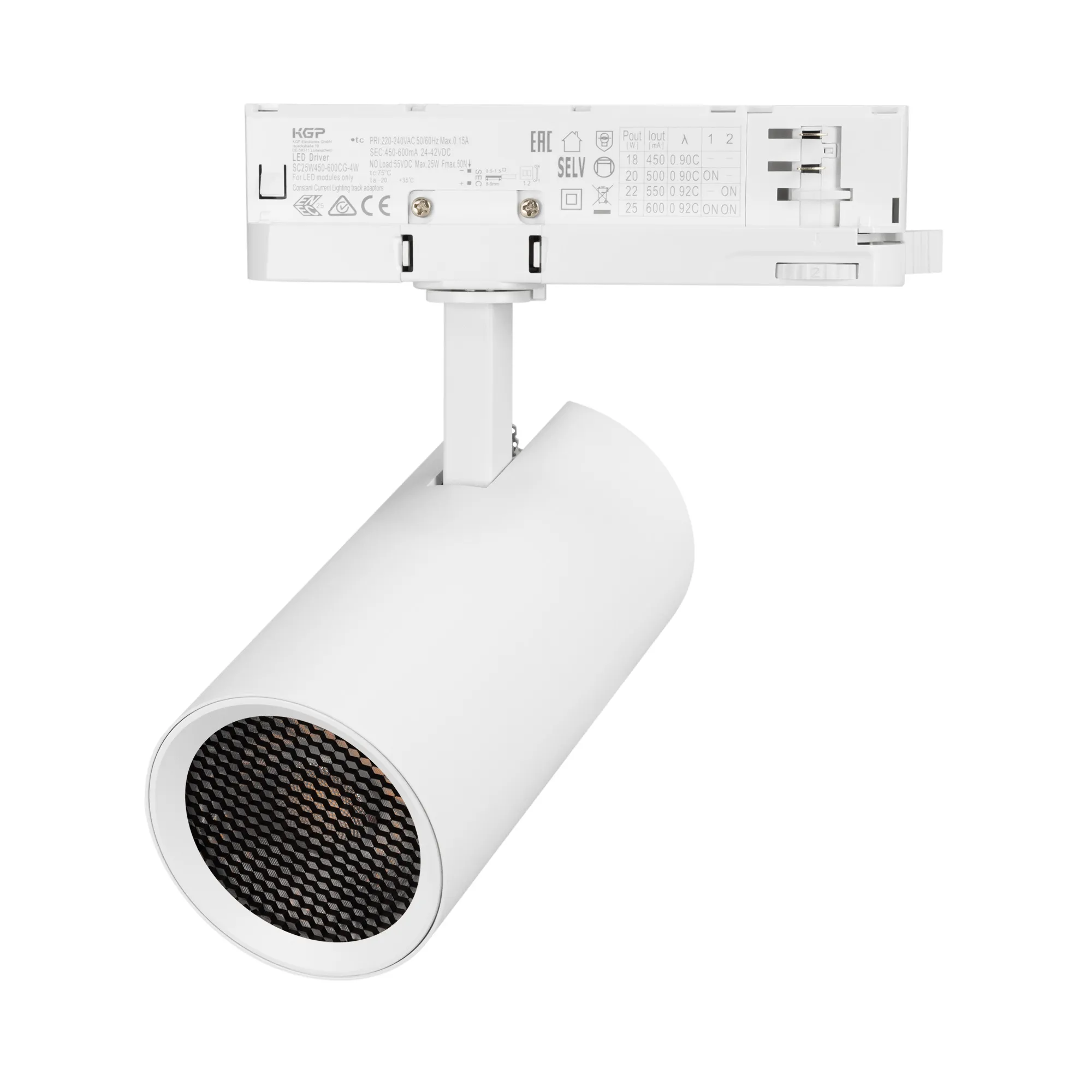 Светильник для треков/шин 4 провода. Мощность 20 Вт, св. поток без решетки honeycomb 2000 лм, 100 лм/Вт, с решеткой honeycomb 1320 лм, 66 лм/Вт, дневной 4000 K, CRI>90, угол 55°, напряжение питания 230 В. Белый круглый корпус из алюминия, материал линзы PMMA, степень защиты IP20. Размер: диаметр 74 мм, длина световой части 154 мм. Монтаж на трек 3-фазный. Драйвер встроенный 24-42 В, 500мА., пульсация <5%