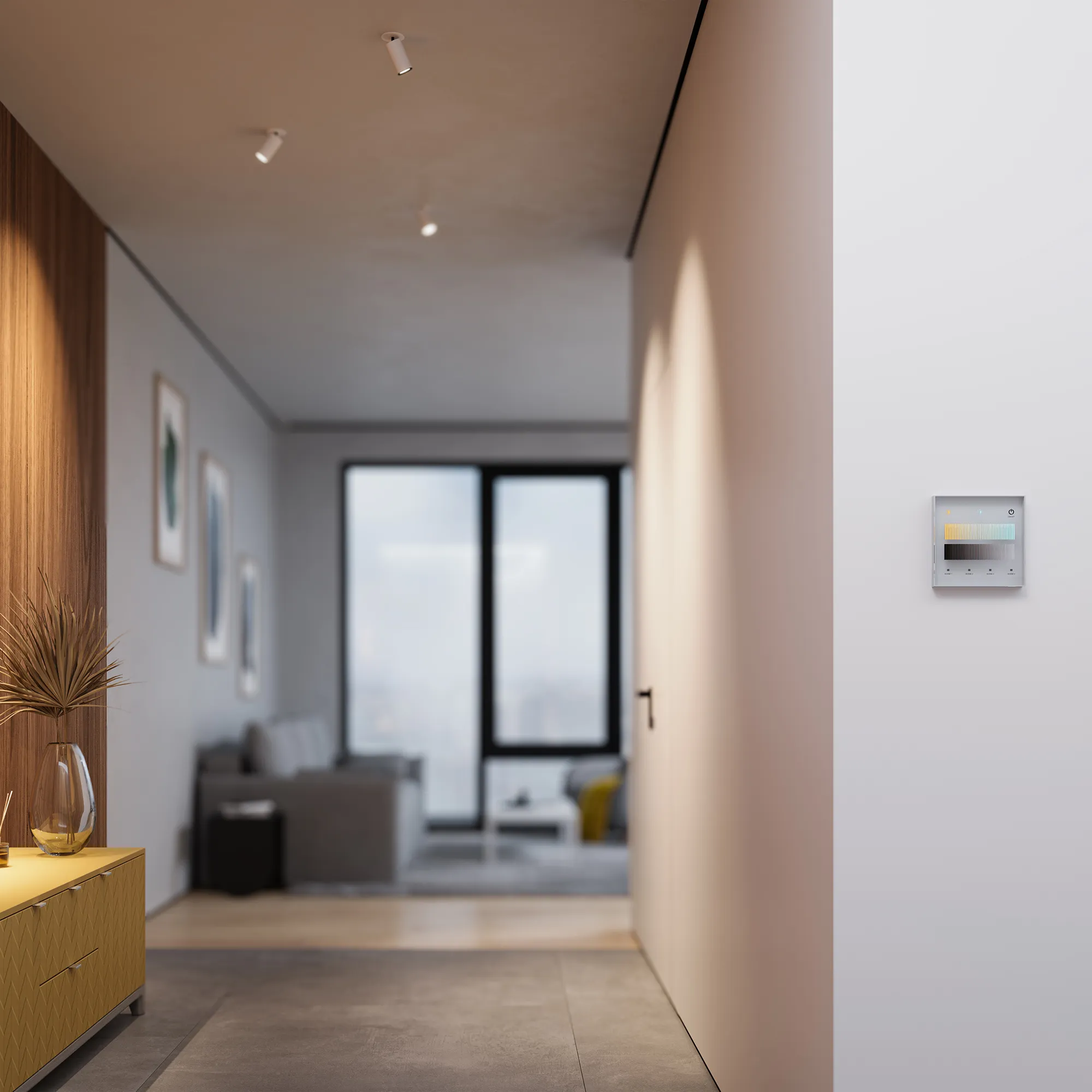 Встраиваемая стеклянная сенсорная панель MIX с выходом DALI. Цвет- белый. Управление DALI 1 адрес / DALI группа / DALI Broadcast. Установка адресов управления выполняется переключателями на корпусе. Питание 24VDC, либо по шине DALI. Сохранение 4-х пользовательских сценариев. Доступно управление с помощью пультов RF 2.4GHz серии SMART. Размеры: 86x86x34.5 мм