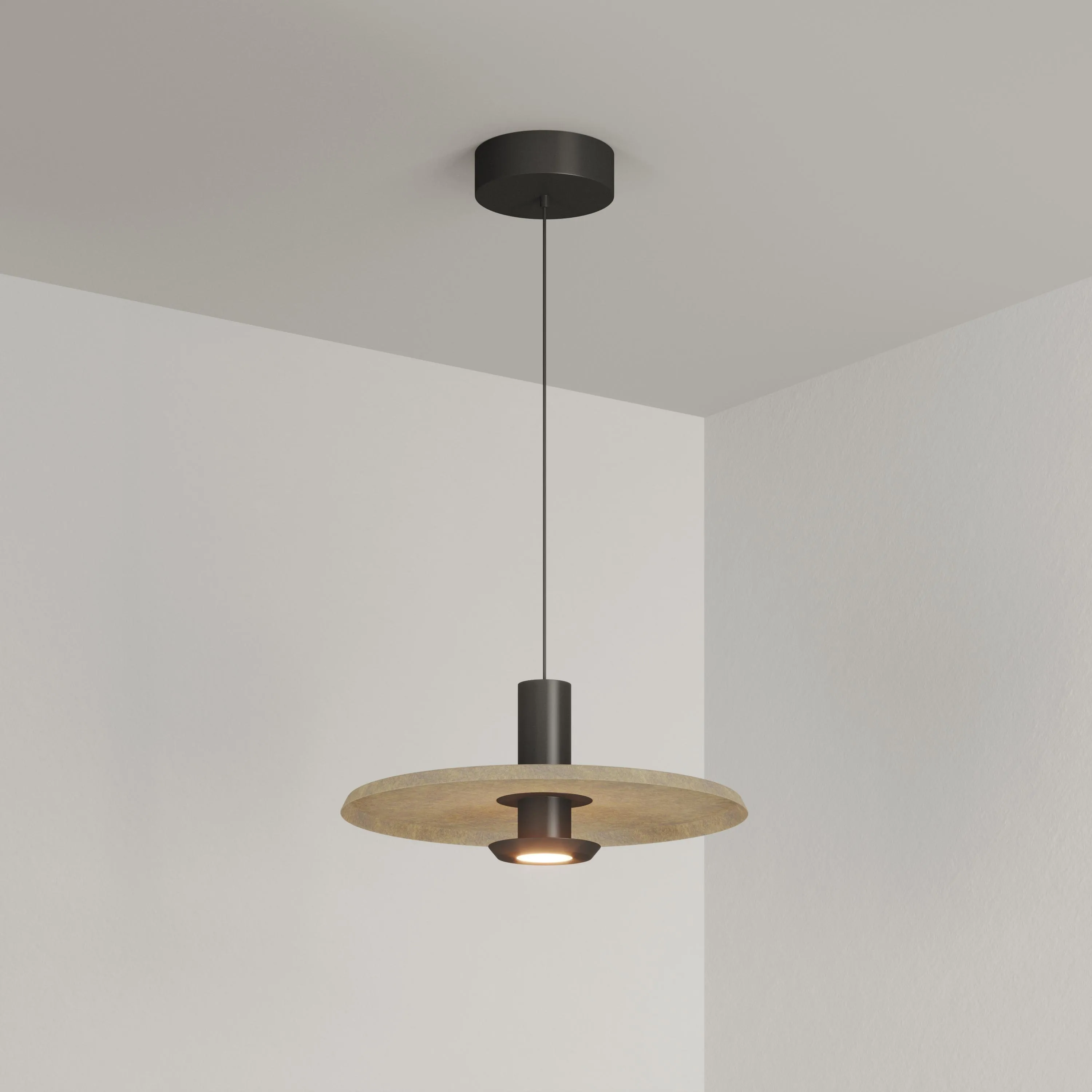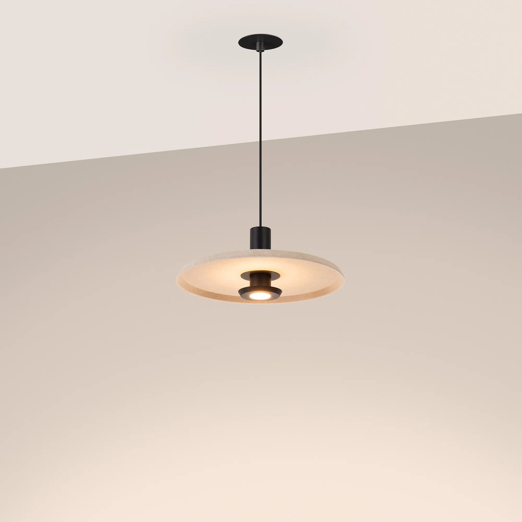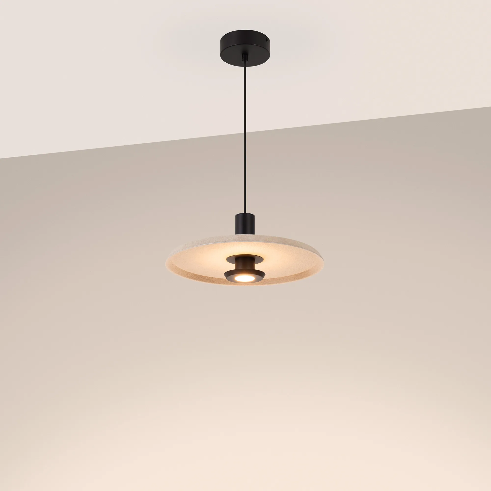 Подвесной светильник. Мощность 12 Вт, св. поток 708 лм, 59 лм/Вт, теплый 3000 K, CRI>94, угол 36°, напряжение питания 230 В. Бежевый фигурный корпус из переработанного фетра с бежевой внутренней поверхностью, линза-рассеиватель из PMMA, степень защиты IP20. Размер: диаметр 350 мм, высота 145 мм. Монтаж подвесной, длина подвеса 2000 мм, регулируемая. В комплекте 2 вида чаш. Габариты чаши (встраиваемая) Ø80 х 23 мм, врезное отверстие Ø60 мм. Габариты чаши (накладная) Ø120 x 35 мм. Драйвер 59 В, 300 мА, пульсация <1%. Управление по TRIAC.