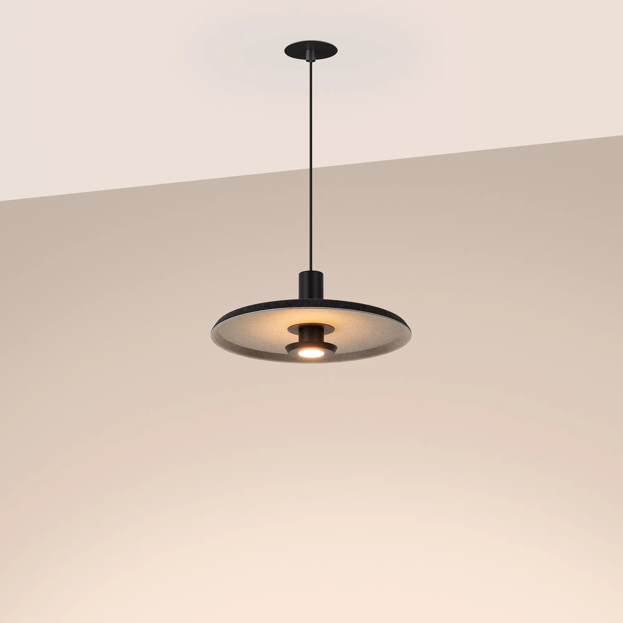 Подвесной светильник. Мощность 12 Вт, св. поток 597 лм, 49 лм/Вт, теплый 2700 K, CRI>94, угол 36°, напряжение питания 230 В. Темно-серый фигурный корпус из переработанного фетра с светло-серой внутренней поверхностью, линза-рассеиватель из PMMA, степень защиты IP20. Размер: диаметр 350 мм, высота 145 мм. Монтаж подвесной, длина подвеса 2000 мм, регулируемая. В комплекте 2 вида чаш. Габариты чаши (встраиваемая) Ø80 х 23 мм, врезное отверстие Ø60 мм. Габариты чаши (накладная) Ø120 x 35 мм. Драйвер 59 В, 300 мА, пульсация <1%. Управление по TRIAC.