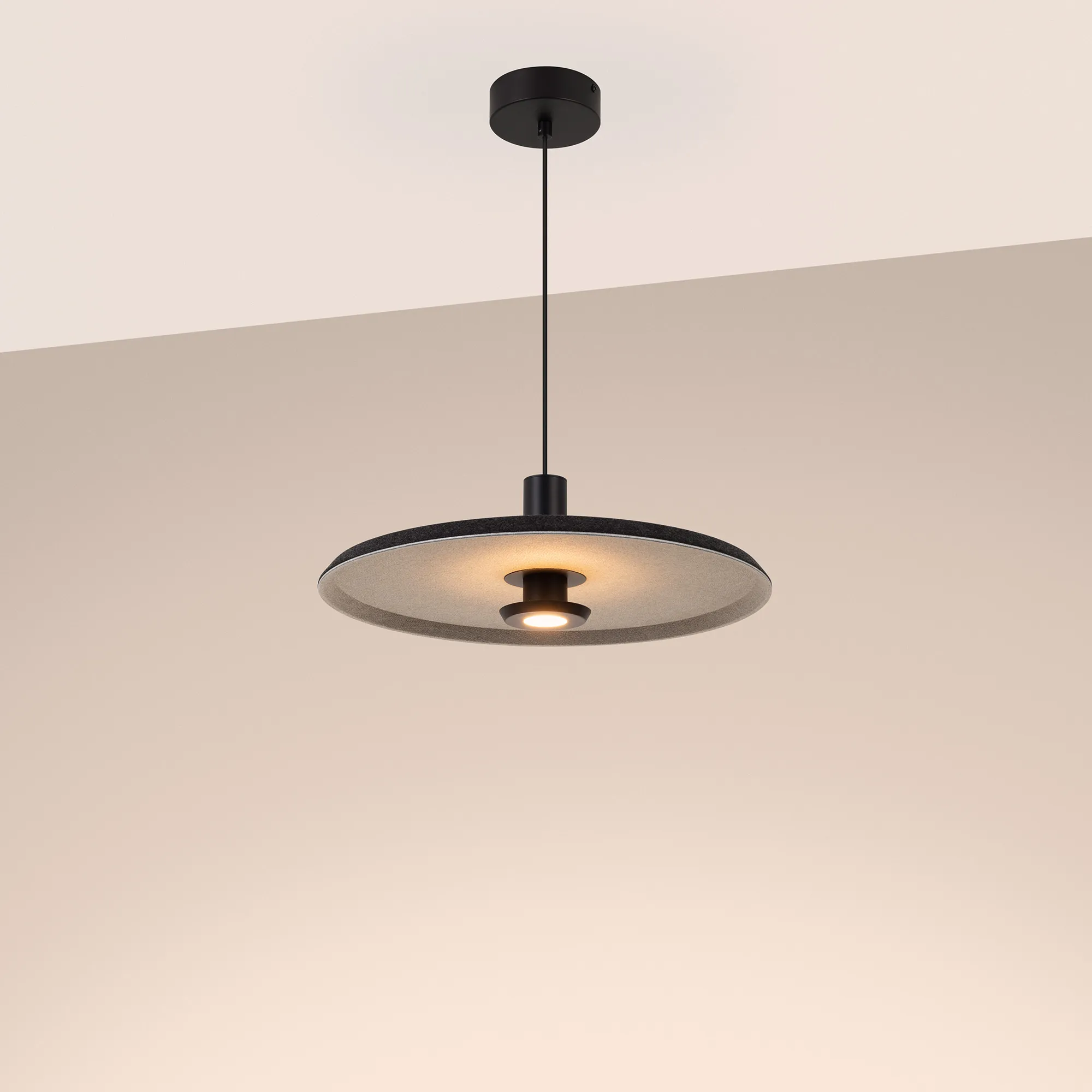 Подвесной светильник. Мощность 12 Вт, св. поток 648 лм, 64 лм/Вт, теплый 2700 K, CRI>94, угол 36°, напряжение питания 230 В. Темно-серый фигурный плафон из переработанного фетра со светло-серой внутренней поверхностью, линза-рассеиватель из PMMA, степень защиты IP20. Размер: диаметр 450 мм, высота 145 мм. Монтаж подвесной, длина подвеса 2000 мм, регулируемая. В комплекте 2 вида чаш. Габариты чаши (встраиваемая) Ø80 х 23 мм, врезное отверстие Ø60 мм. Габариты чаши (накладная) Ø120 x 35 мм. Драйвер 59В, 300 мА, пульсация <1%. Управление по TRIAC.