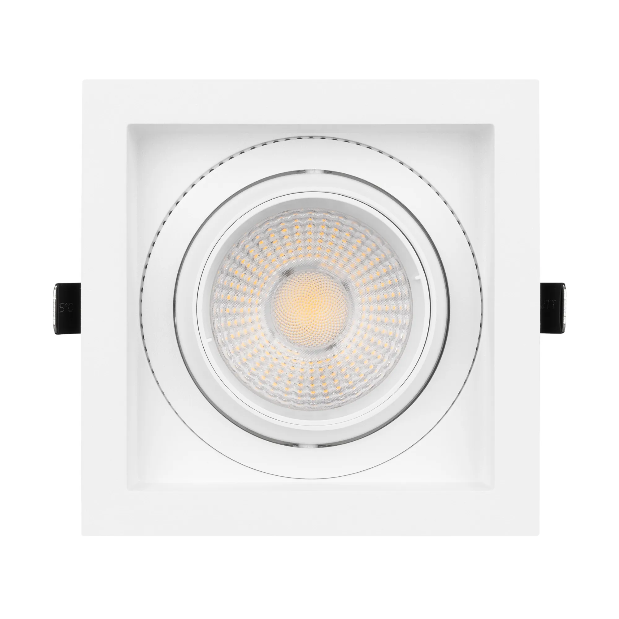 Встраиваемый карданный светильник. Мощность 30 Вт, св. поток 2650 лм, 89 лм/Вт, дневной 4000 K, CRI>92, угол 50°, напряжение питания 230 В. Белый корпус из алюминия, белая вставка, степень защиты IP20. Размер: длина 140 мм, ширина 140 мм, высота 125 мм. Монтаж встраиваемый, установочное отверстие: длина 120 мм, ширина 120 мм. Драйвер 24-42 В, 750 мА, пульсация <2%.