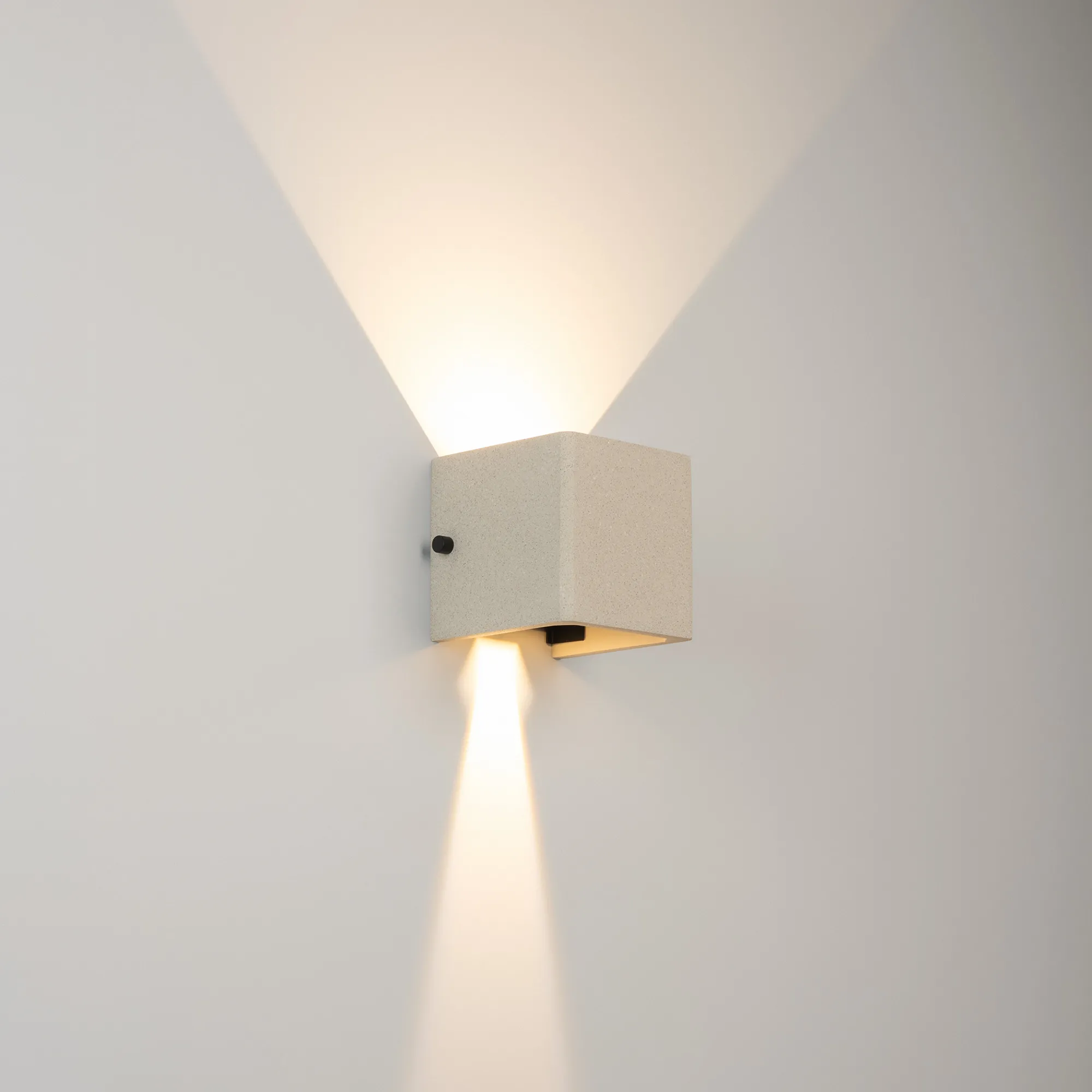 Накладной настенный светильник, свечение вверх/вниз. Мощность 6 Вт, св. поток 286 лм, 49 лм/Вт, теплый 3000 K, CRI>90, изменяемый угол освещения 0°-80°, напряжение питания 230 В. Фигурный корпус из бетона белого цвета и алюминия, экран ударопрочный PC, степень защиты IP65. Размер: длина 120 мм, ширина 120 мм, высота 120 мм. Монтаж накладной. Драйвер встроенный, пульсация <0.5%.