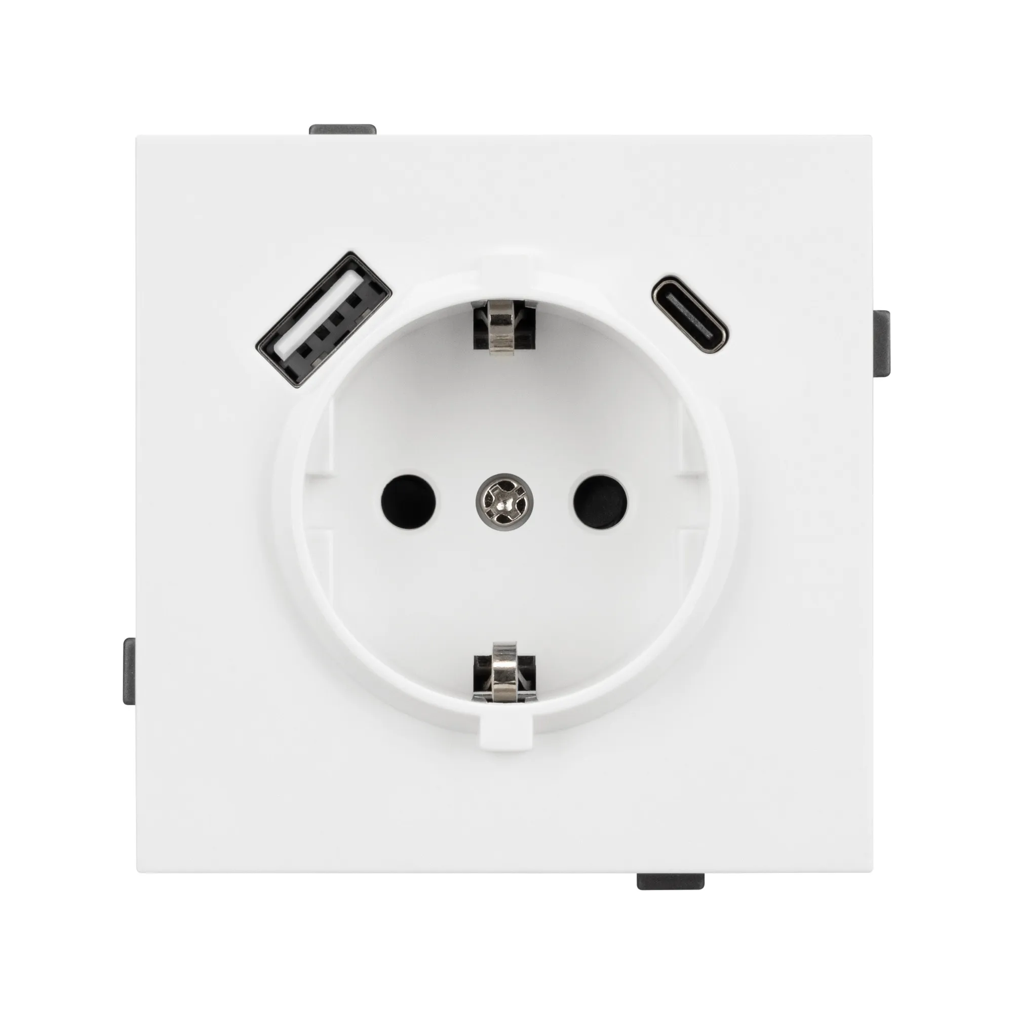 Механизм розетки с заземлением 1 пост 2 USB Type A+C порта. Цвет - белый. Без фронтальной рамки. Уровень пылевлагозащиты IP20. Розетка устанавливается в стандартный подрозетник круглого сечения диаметром 60мм.