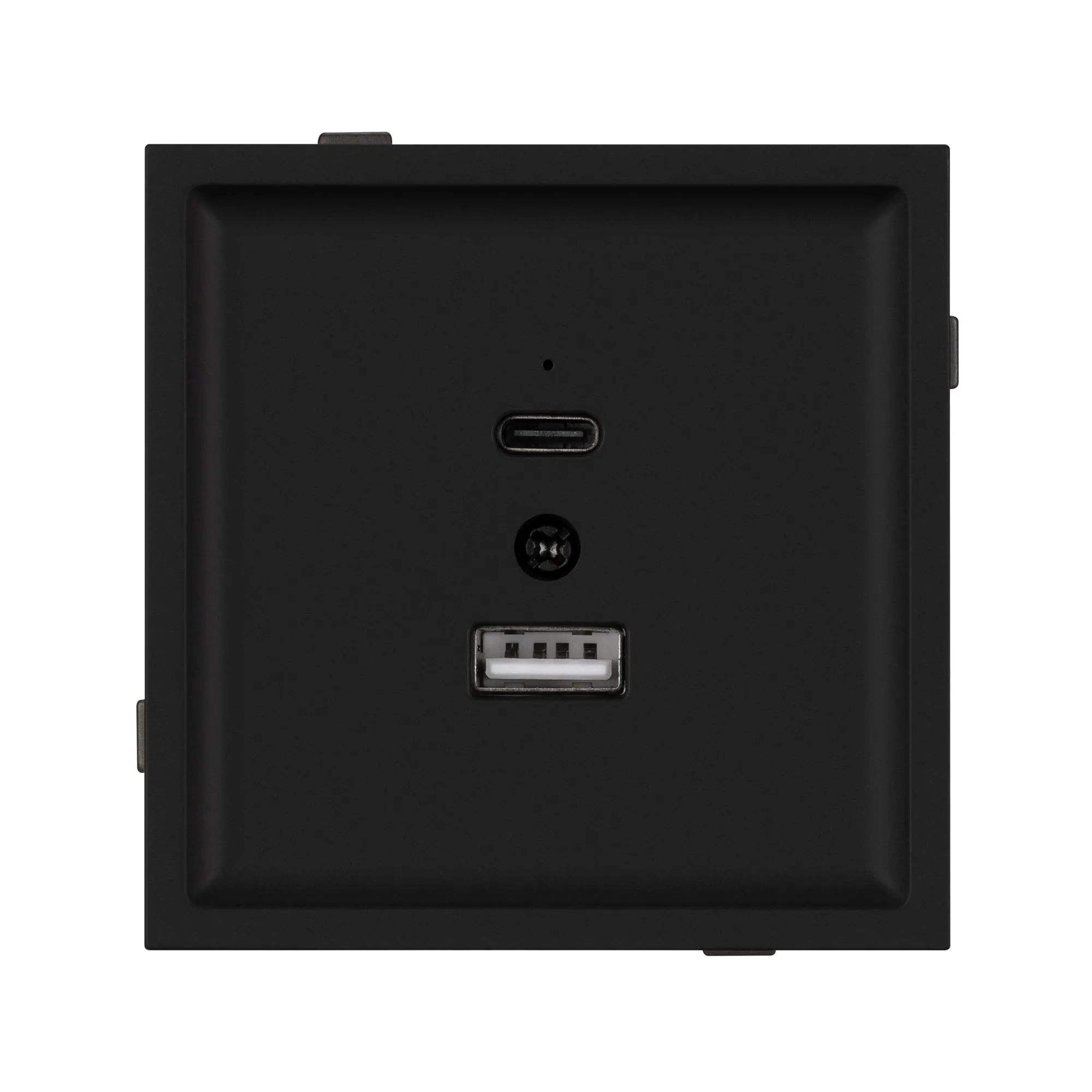 Механизм USB розетки на 2 порта Type A + Type C . Цвет - матовый черный, с Soft-Touch покрытием. Без фронтальной рамки. Выходная мощность для USB Type C порта не превышает 20W. Уровень пылевлагозащиты IP20. Устанавливается в стандартный подрозетник круглого сечения диаметром 60мм.