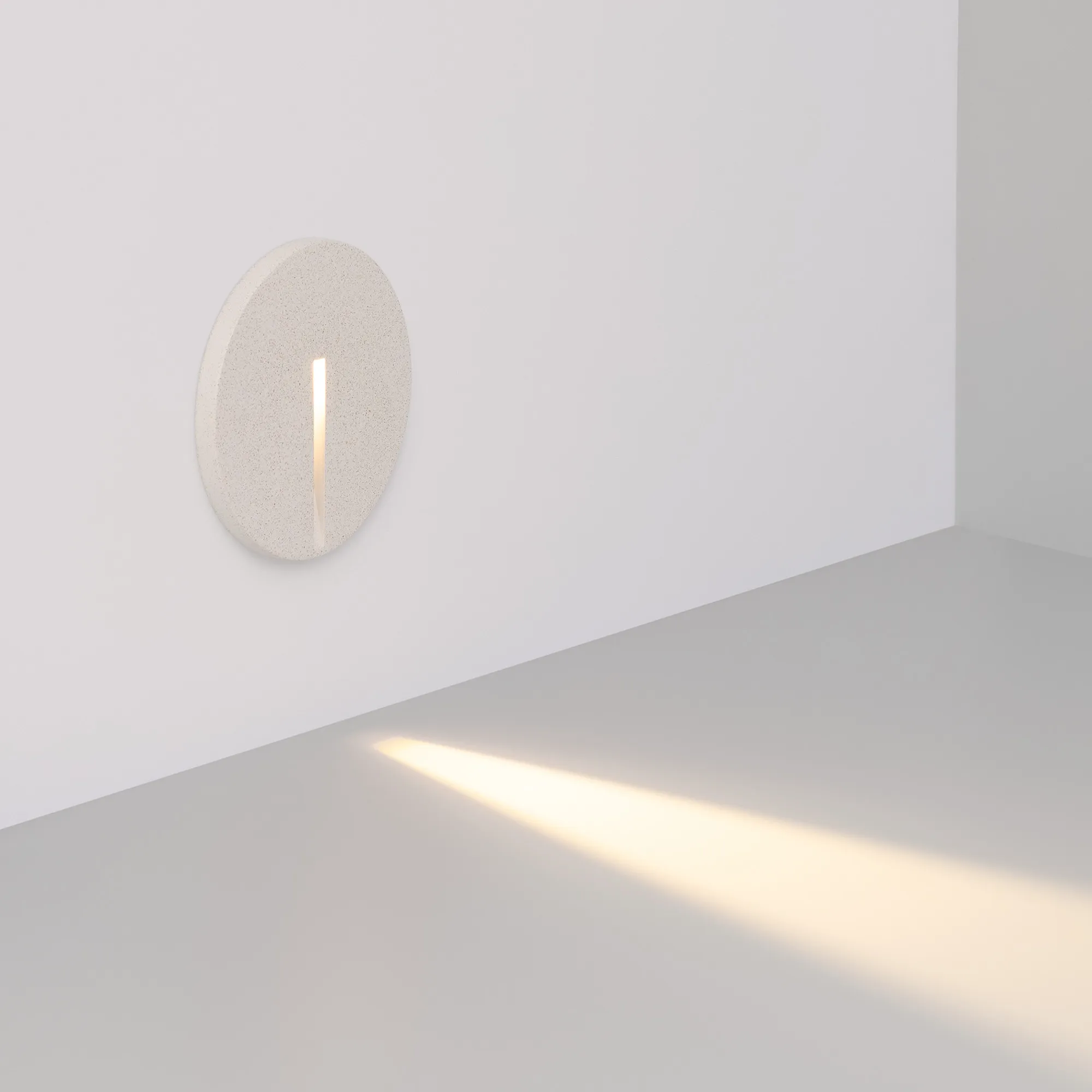 Светодиодный встраиваемый круглый светильник для стен, лестниц. Мощность 3Вт, световой поток 32 лм, теплый 3000К, угол 25x45°, CRI>80, напряжение 230 В. Круглый корпус из бетона белого цвета и алюминия. Степень защиты IP65. Питание AC230V, мощность 3Вт. Размеры DxH 120x76мм. Драйвер встроенный, пульсация <0.5%.