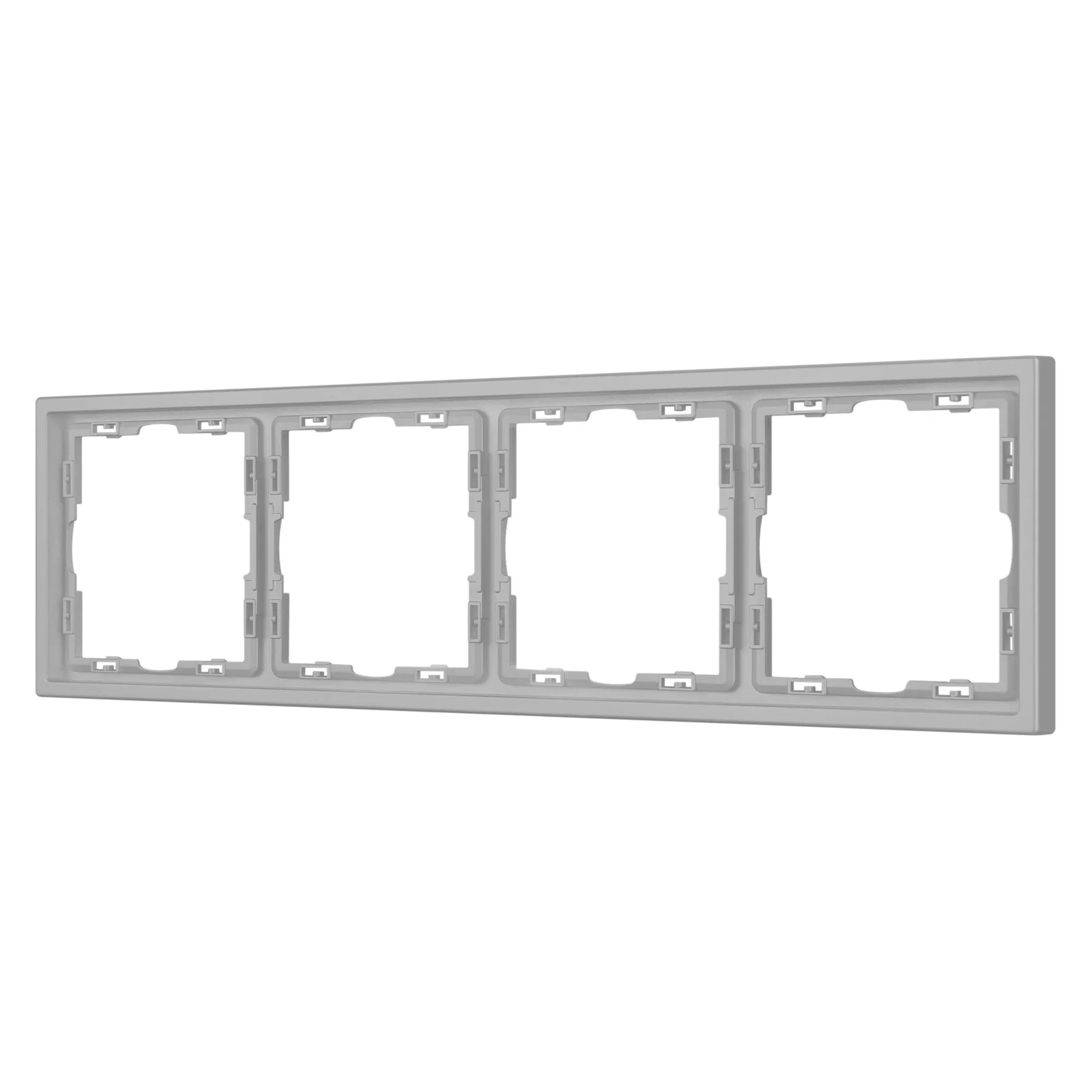 Рамка пластиковая на 4 поста, под встраиваемый механизм. Цвет - никель, с Soft-Touch поверхностью. Среднего уровня герметичности IP20. Ориентация монтажа горизонтальная.
