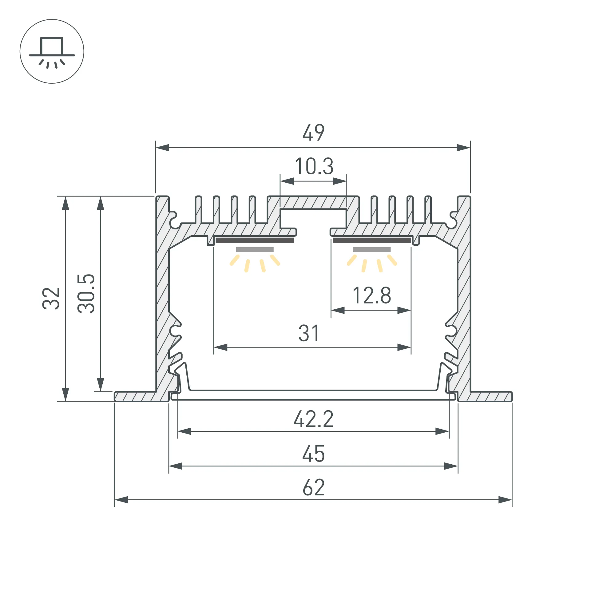 Алюминиевый анодированный профиль для светодиодных лент и линеек. Габаритные размеры (L×W×H): 3000x62x32 мм, паз для установки 49 мм. Ширина площадки для ленты 31 мм. Экраны, заглушки и другие аксессуары приобретаются отдельно. Цена за 1 метр.