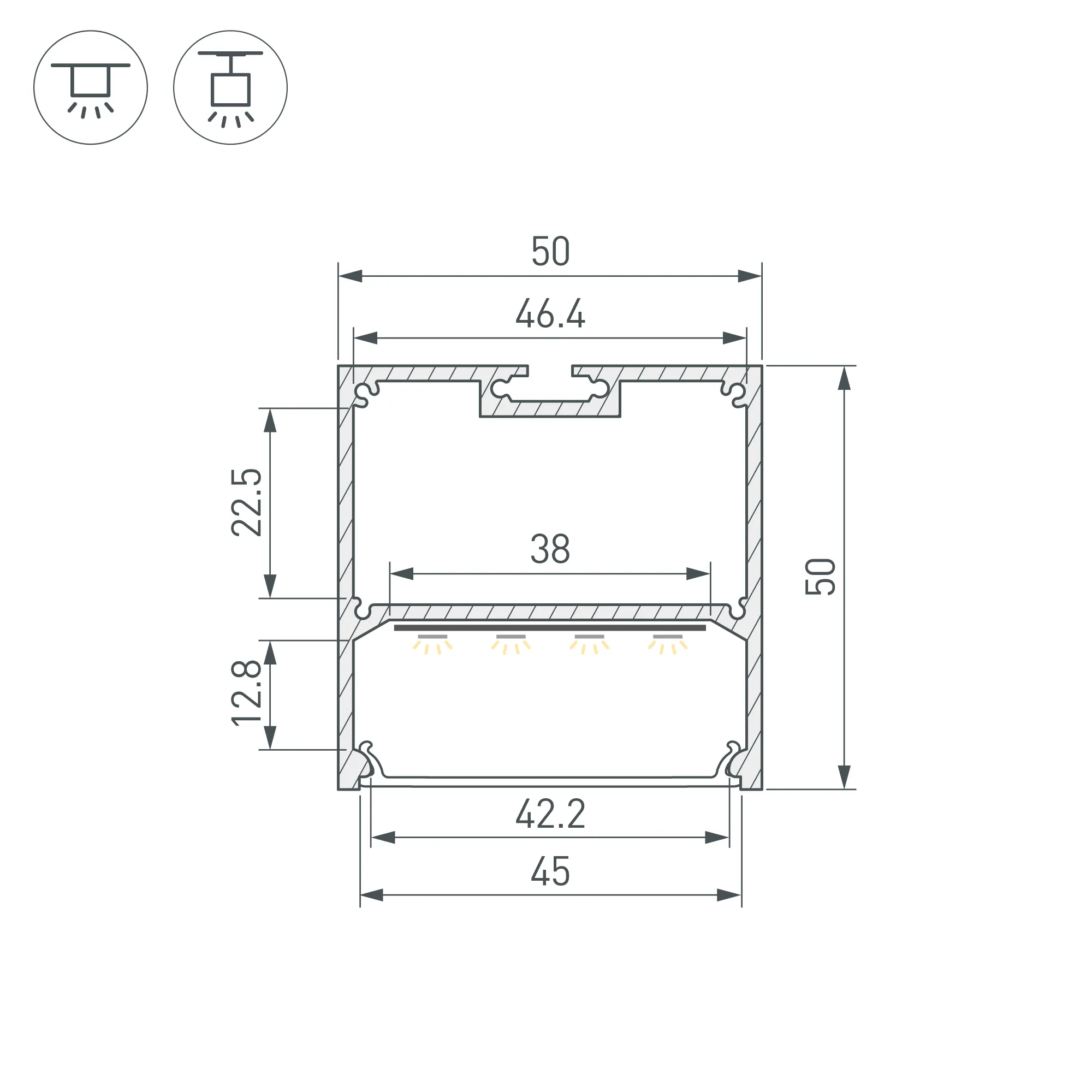 Алюминиевый профиль для светодиодных лент и линеек. Цвет - белый RAL9003 (порошковая окраска). Габаритные размеры (L×W×H): 2000x50x50 мм. Ширина площадки для ленты 38 мм. Отсек для БП 46,4х22,5мм. Экраны, заглушки и другие аксессуары приобретаются отдельно. Цена за 1 метр.